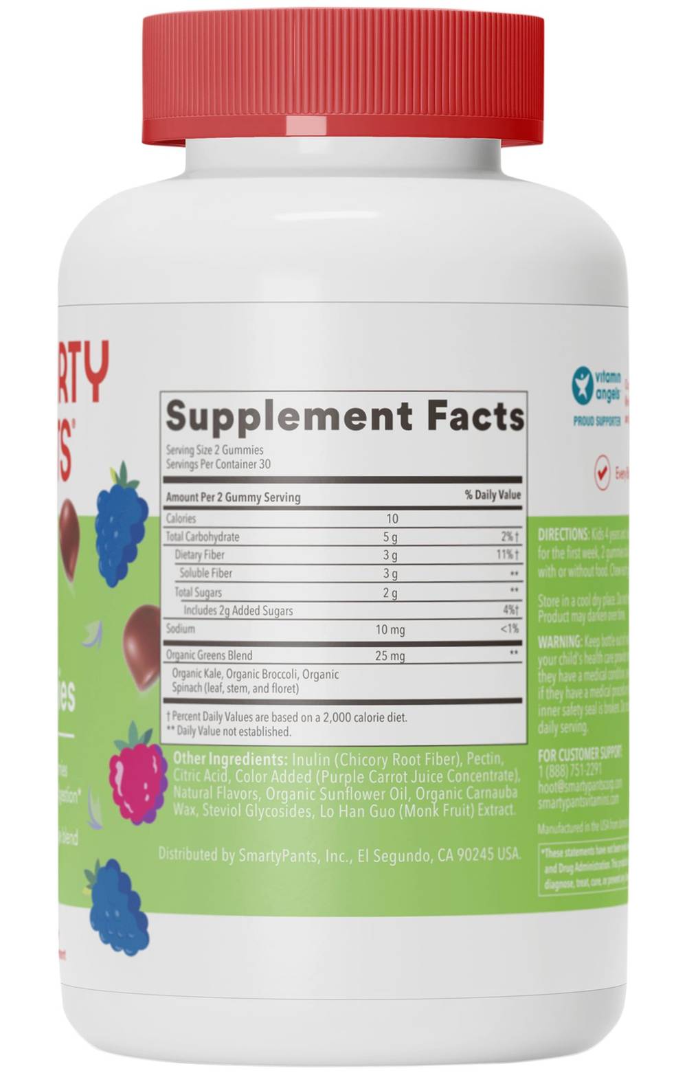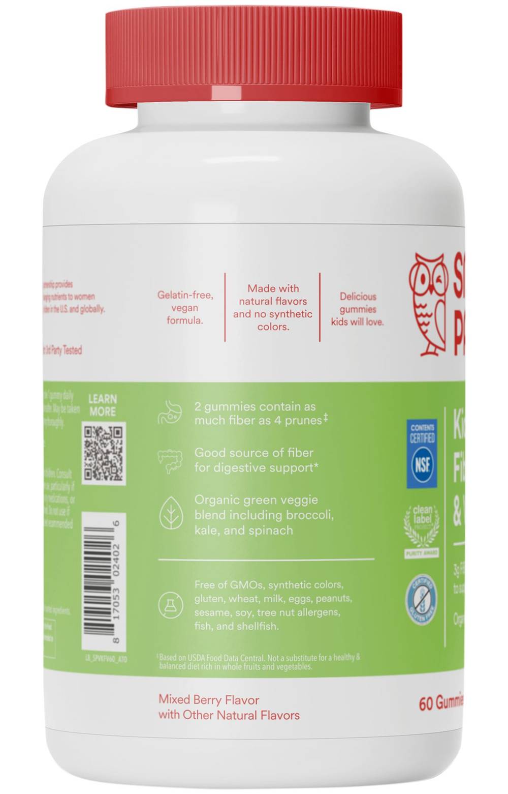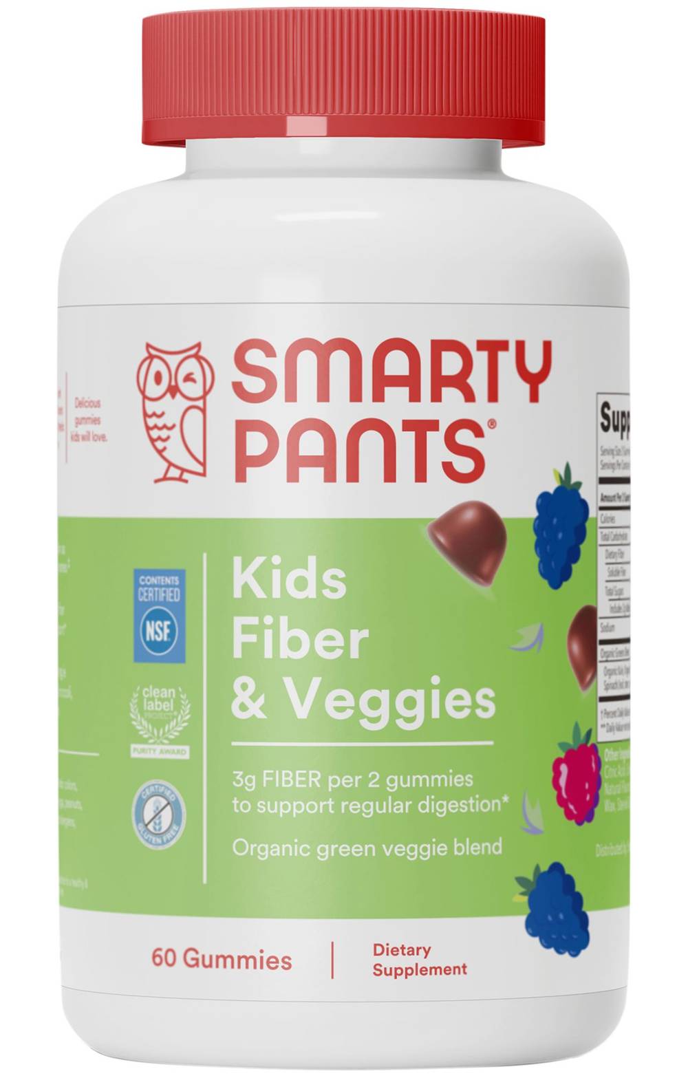 Kids fiber and veggies. 3GM Fiber per 2 gummies to support regular digestion. Organic green veggie blend. 2 gummies contain as much fiber as 4 prunes. Good source of fiber for digestive support. Organic green veggie blend including broccoli, kale, and spinach.