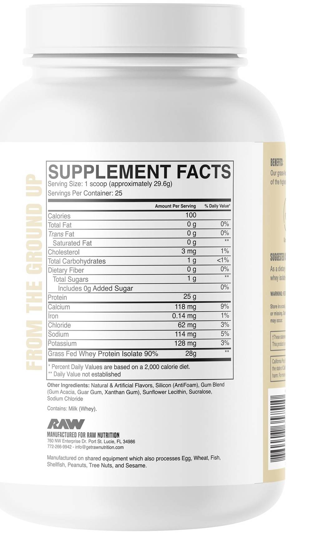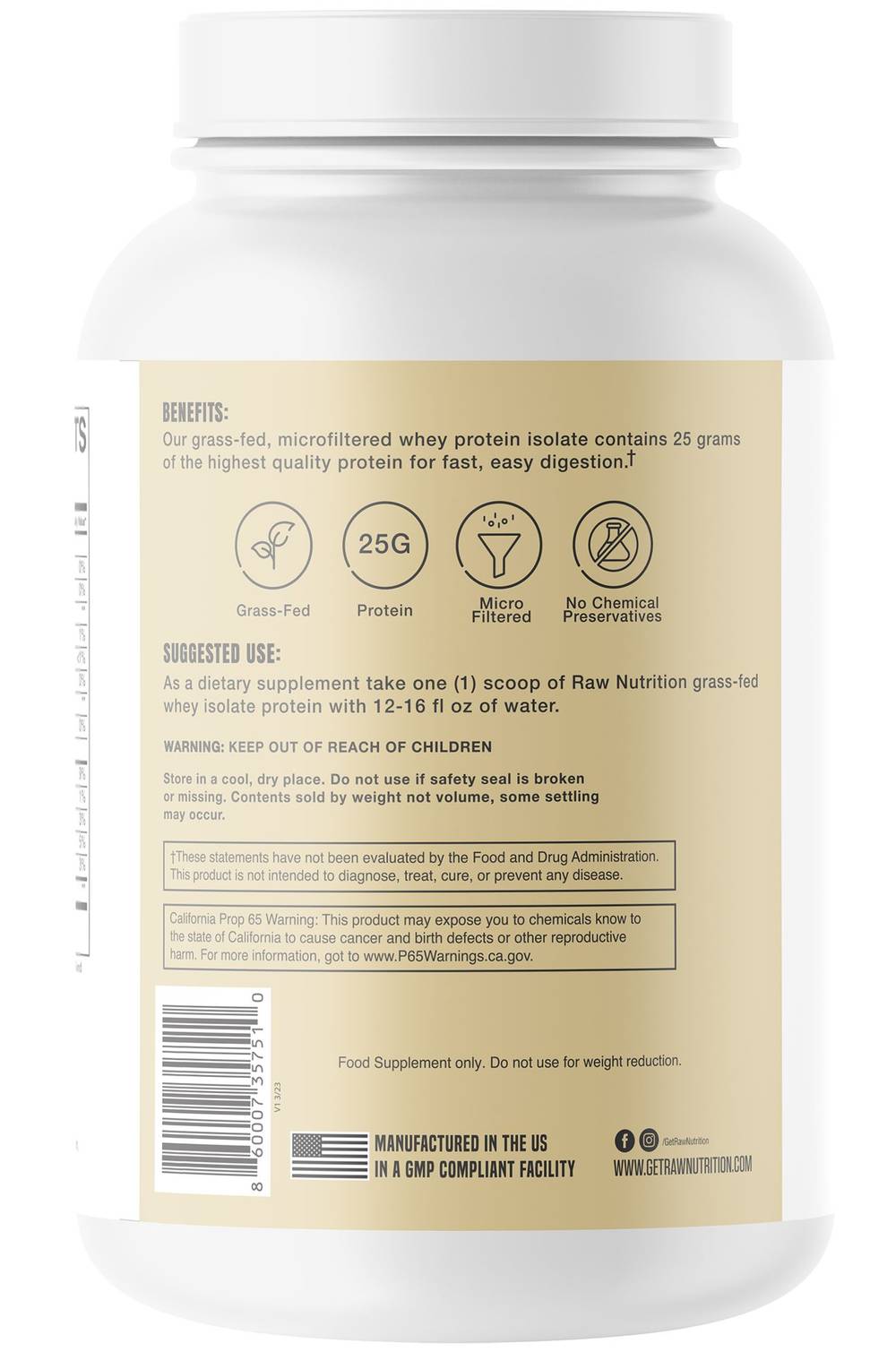 25g of pure whey protein isolate per serving Supports lean muscle mass Quick and easy to digest Vanilla Milkshake flavor Muscle recovery never tasted so good! Grass Fed Whey Protein Isolate from RAW Nutrition promotes the growth of lean muscle tissue while fueling recovery with 25g of micro-filtered whey isolate. This powdered protein digests smooth and fast for immediate use by the body and contains no fillers or additives. Frequently Asked Questions What is whey protein isolate? Whey protein isolate (WPI) has the highest concentration of protein and BCAAs, while having less carbs, cholesterol, and fat compared to other whey proteins. WPI is also low in lactose and easy on your digestive tract. Are protein shakes good for you?