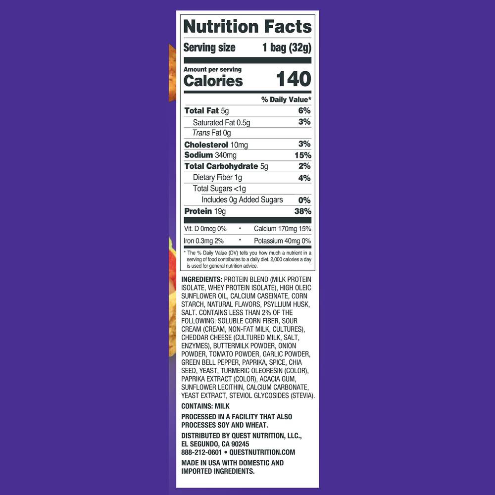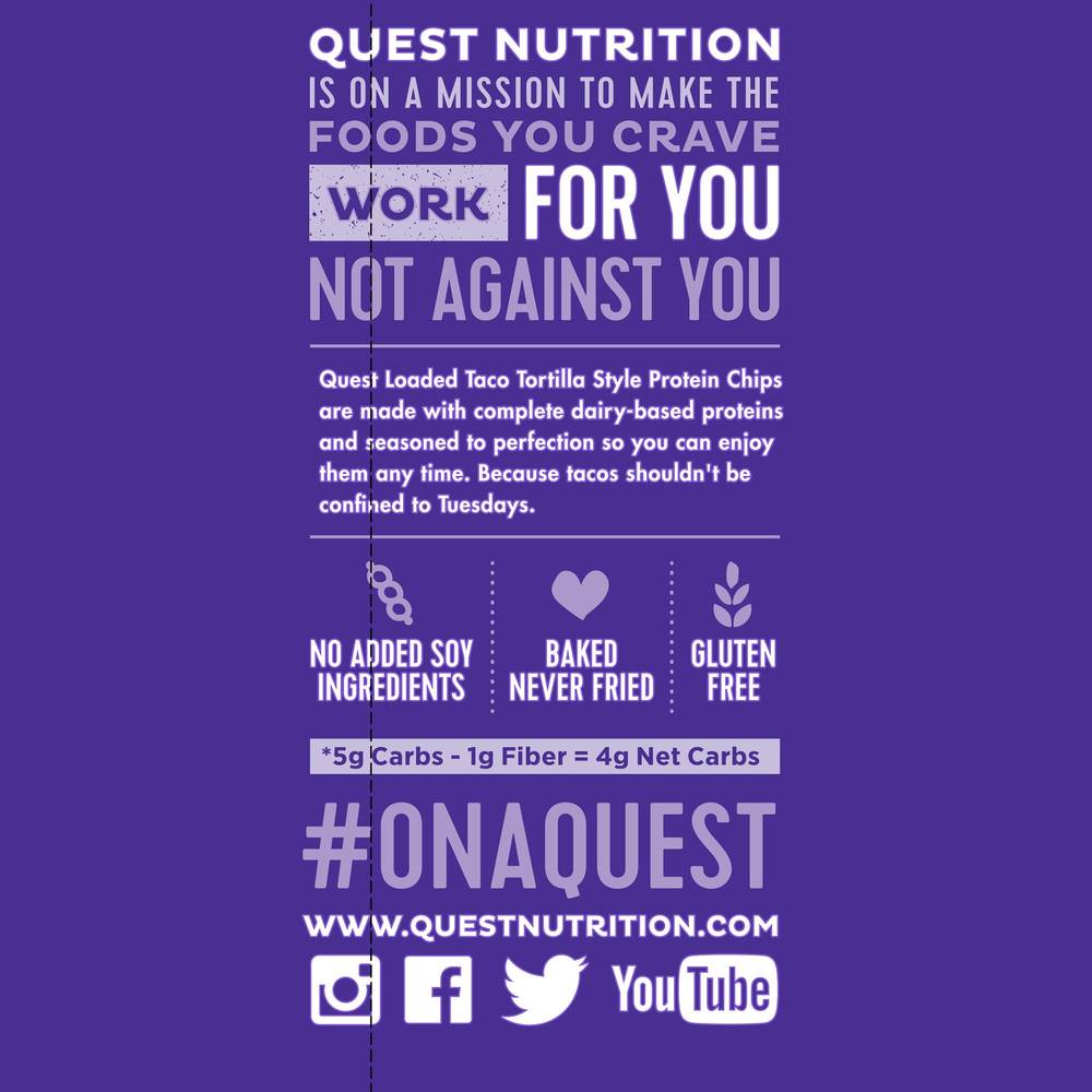 Say hola to the Quest Loaded Taco Tortilla Style Protein Chips! Each crunchy chip is seasoned with loaded taco flavor and ready to feed your taco cravings whenever they hit.19g Protein4g Net carbsLess than 1g Sugar1g FiberCertified Gluten-Free