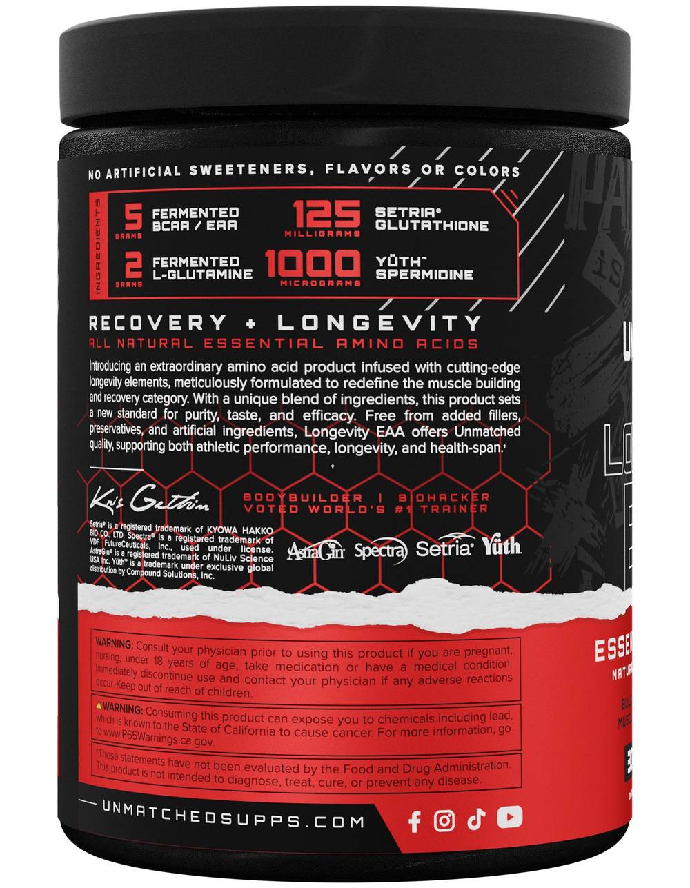 Build Muscle. Increase Healthspan. Enhance Recovery. Recovery & Longevity. All natural essential amino acids. Introducing an extraordinary amino acid product infused with cutting edge longevity elements, meticulously formulated to redefine the muscle building and recovery category. With a unique blend of ingredients, this product sets a new standard for purity, taste, and efficacy. Free from added fillers, perservatives, and artificial ingredients, Longevity EAA offers unmatched quality, supporting both athletci performance, longevity, and health-span.