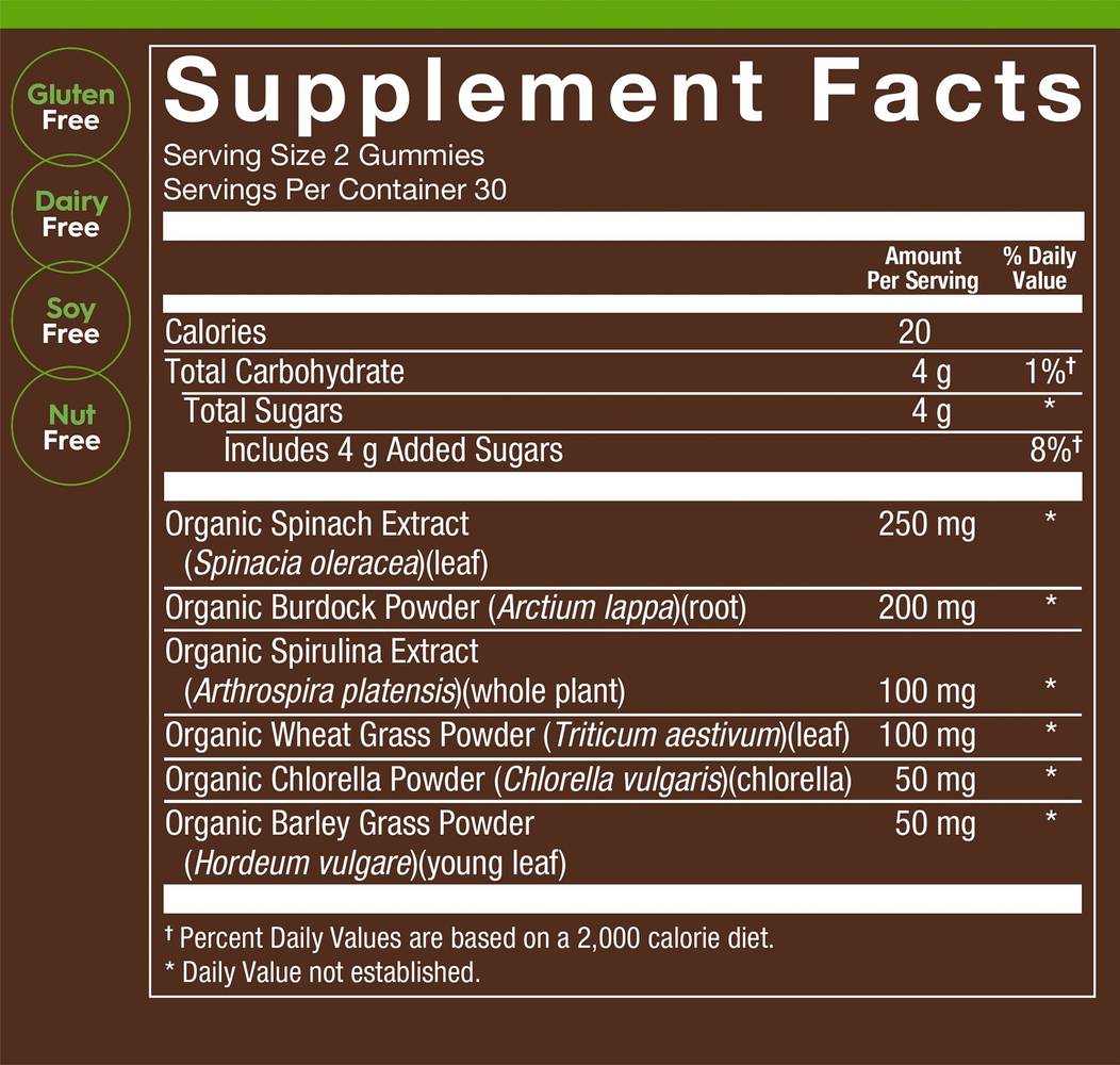 Provides antioxidant support Made from real greens Certified USDA Organic, Certified Vegan, and Non-GMO Project Verified Free of gluten, dairy, soy, and nuts Apple flavor Not big on greens powders or juices? Sink your teeth into Organic Wild Greens Gummies! These tasty vegan gummies are packed with spinach, burdock, spirulina, chlorella, and wheat and barley grasses for a daily antioxidant boost. All plnt� products are made from whole food or plant-based ingredients sourced in nature, contain zero synthetic colors, sweeteners, or flavors, and are always tested to ensure purity and potency. Frequently Asked Questions What is burdock? Related to the dandelion, burdock is an herb that contains iron, calcium, vitamin