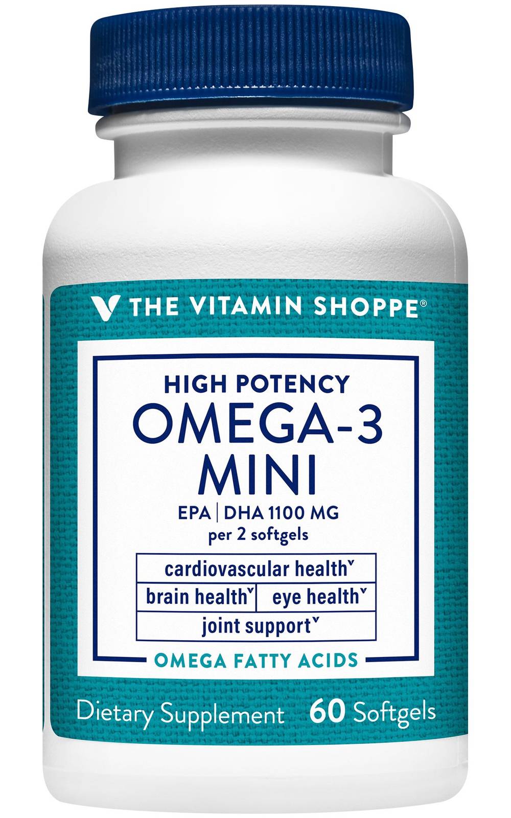 Promotes cardiovascular, brain, and eye healthSupports healthy jointsSuitable for everyday wellness seekersFree of gluten, dairy, soy, and artificial colors or flavors No fishy burps, just head-to-toe benefits. Packed with EPA and DHA omega-3 fatty acids, The Vitamin Shoppe® brand High Potency Omega-3 minis deliver heart, brain, eye and joint support all-in-one. Take 2 easy-to-swallow softgels per day with a meal and you'll be good to go after your wellness goals.