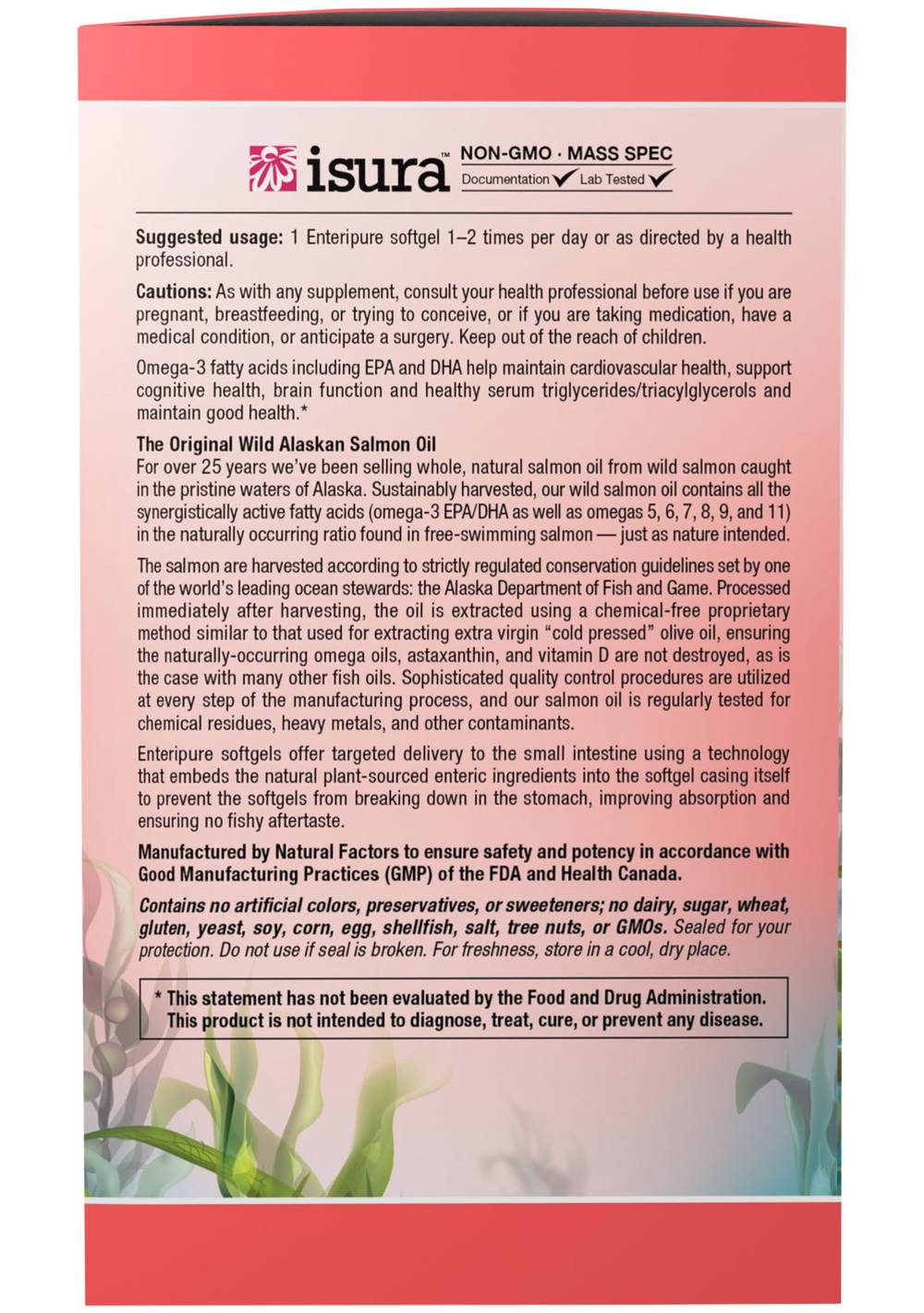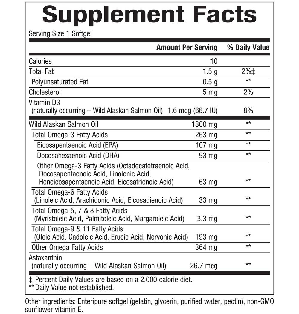 omega-3 fatty acids including EPA and DHA help to maintain cardiovascular health, support cognitive health and brain function, reduce serum triglycerides/triacylglycerols and maintain good health.* The Original Wild Alaskan Salmon Oil For over 25 years we've been selling our whole and natural wild salmon oil, sourced from the pristine waters of Alaska. 100% sustainably wild-caught, our salmon oil contains all the synergistically active omega fatty acids in a ratio found in free-swimming salmon, as well as the antioxidant astaxanthin and vitamin D - just as nature intended. Processed immediately after harvest, the oil is made using a chemical-free proprietary extraction method, in a manner very similar to that used for extraction of extra virgin "cold pressed" olive oil. Our method is temperate so that the naturall