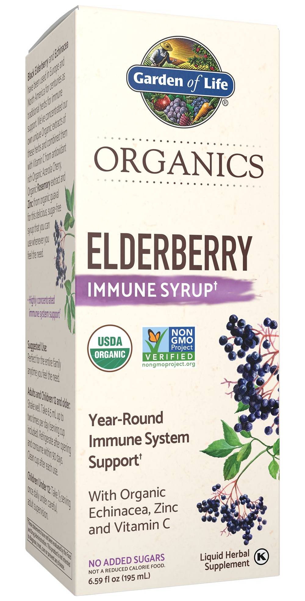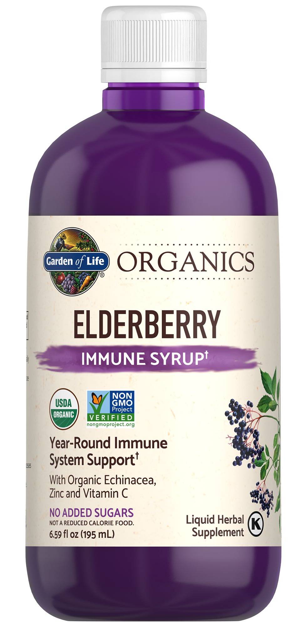 Garden of Life® Organics ElderberryImmune SyrupWith Organic Echinacea, Zinc, and Vitamin CNo Added SugarsUSDA OrganicNon-GMOGluten FreeVeganPareve Kosher Packaging: Reusable