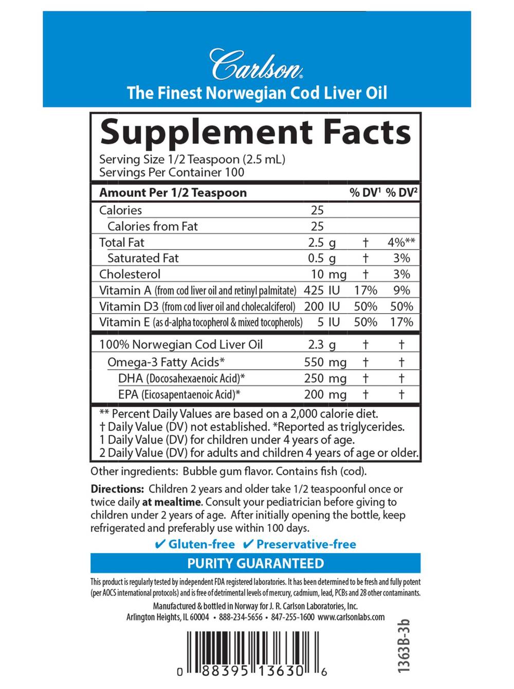 Children'S Norwegian Cod Liver Oil - Omega 3'S, Epa & Dha - Bubble Gum Flavor (8.4 Fluid Ounces)