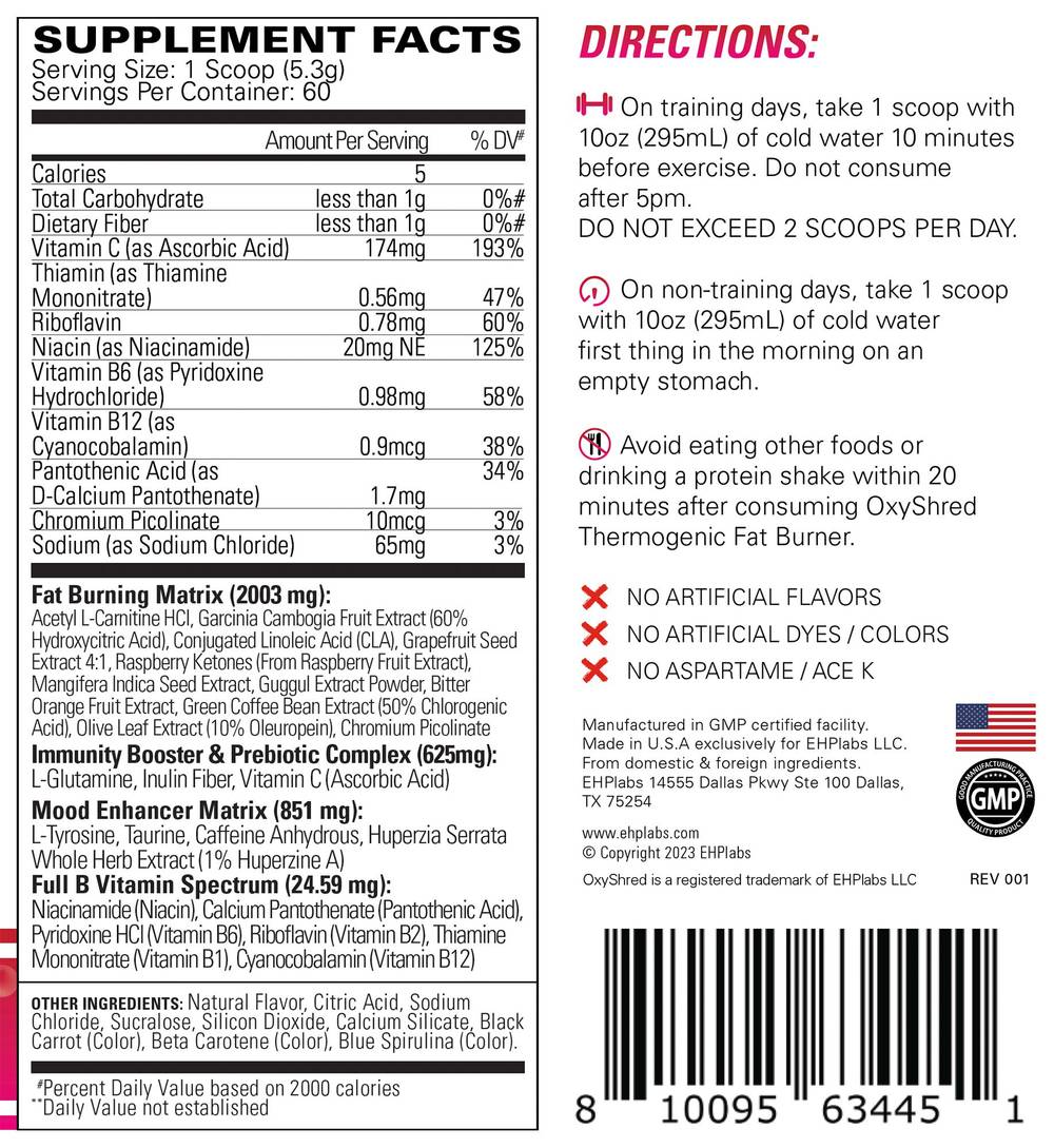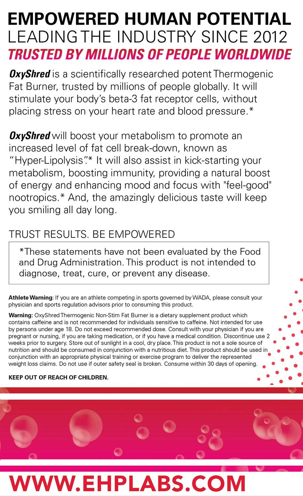 OxyShred is a scientifically researched potent Thermogenic Fat Burner, trusted by millions of people globally. It will stimulate your bodys beta-3 fat receptor cells, without placing stress on your heart rate and blood pressure. OxyShred will boost your metabolism to promote an increased level of fat cell break-down, known as "Hyper-Lipolysis. It will also assist in kick-starting your metabolism, boosting immunity, providing a natural boost of energy and enhancing mood and focus with "feel-good"nootropics. And, the amazingly delicious taste will keep you smiling all day long.