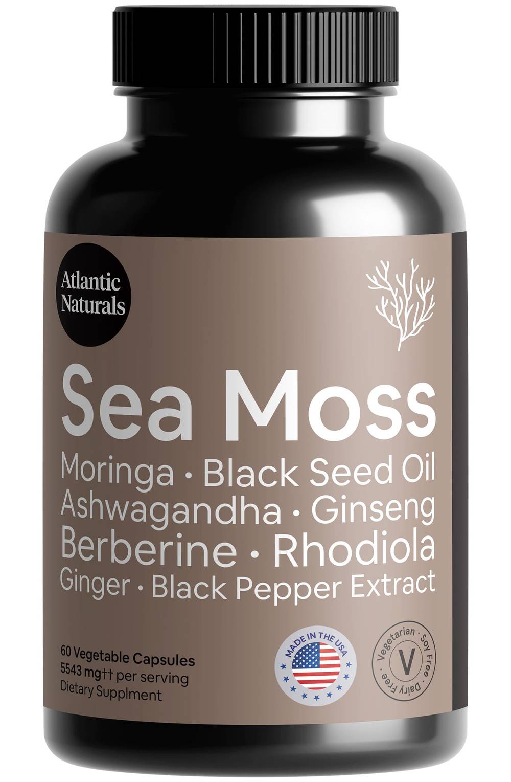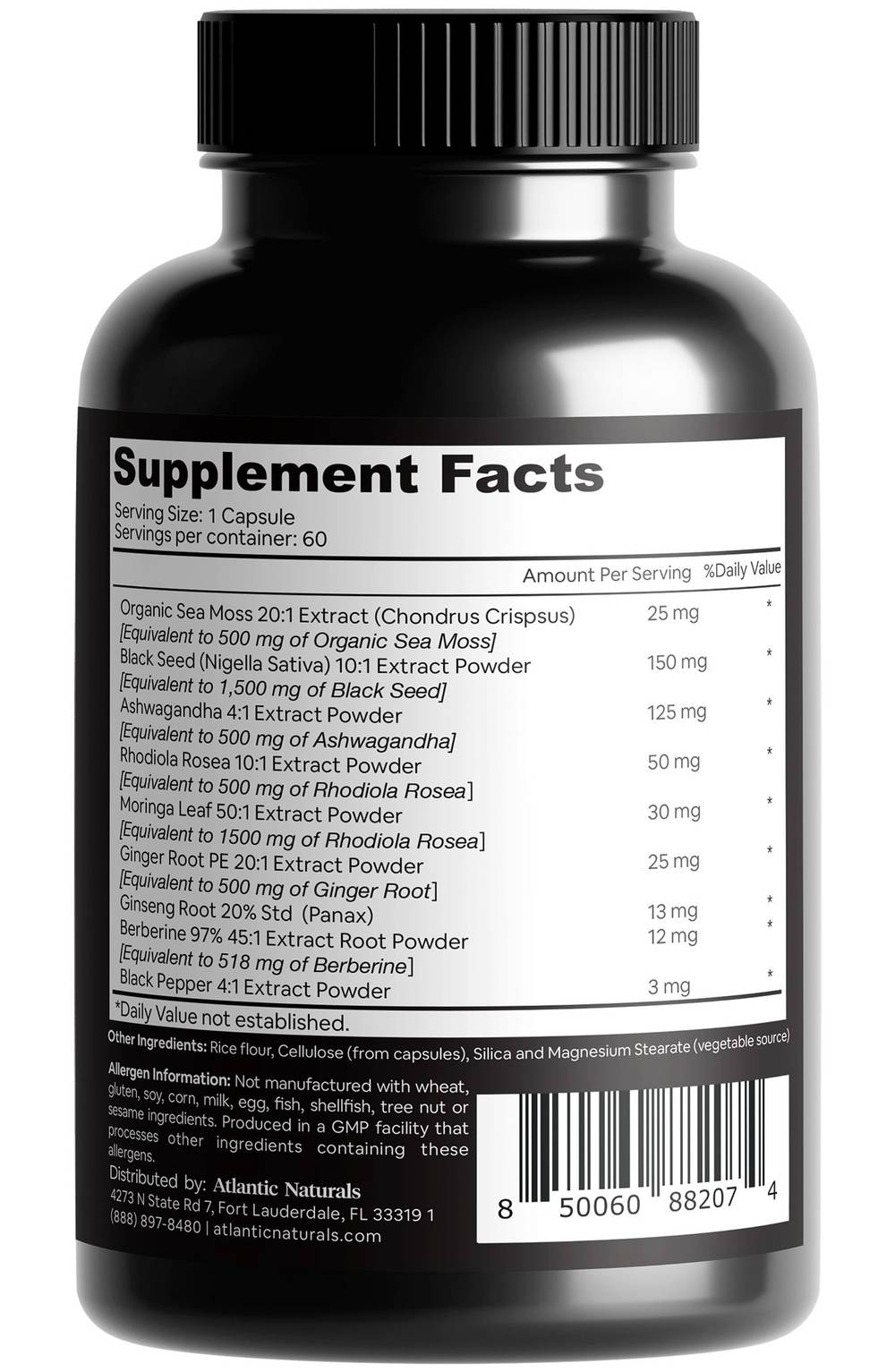 Elevate your wellness routine with Atlantic Naturals' powerful Sea Moss with Black Seed Oil and Moringa 9 in 1 Superfood Capsules. This unique formula combines the best of natures superfoods, featuring Black Seed Oil, Berberine, Moringa, Ashwagandha, Ginseng, Rhodiola, Ginger Root, and Black Pepper for enhanced absorption. Each capsule delivers the equivalent of 5543mg of these potent ingredients, carefully extracted to ensure maximum potency and effectiveness. Benefits: Sea Moss: Rich in essential vitamins and minerals, supporting overall health. Black Seed Oil: Known for its immune-supporting and wellness properties. Moringa: A nutritional powerhouse, providing antioxidants and essential amino acids. Berberine: Supports blood sugar wellness and metabolism. Adaptogens: Ashwagandha, Ginseng, and Rhodiola help your bod