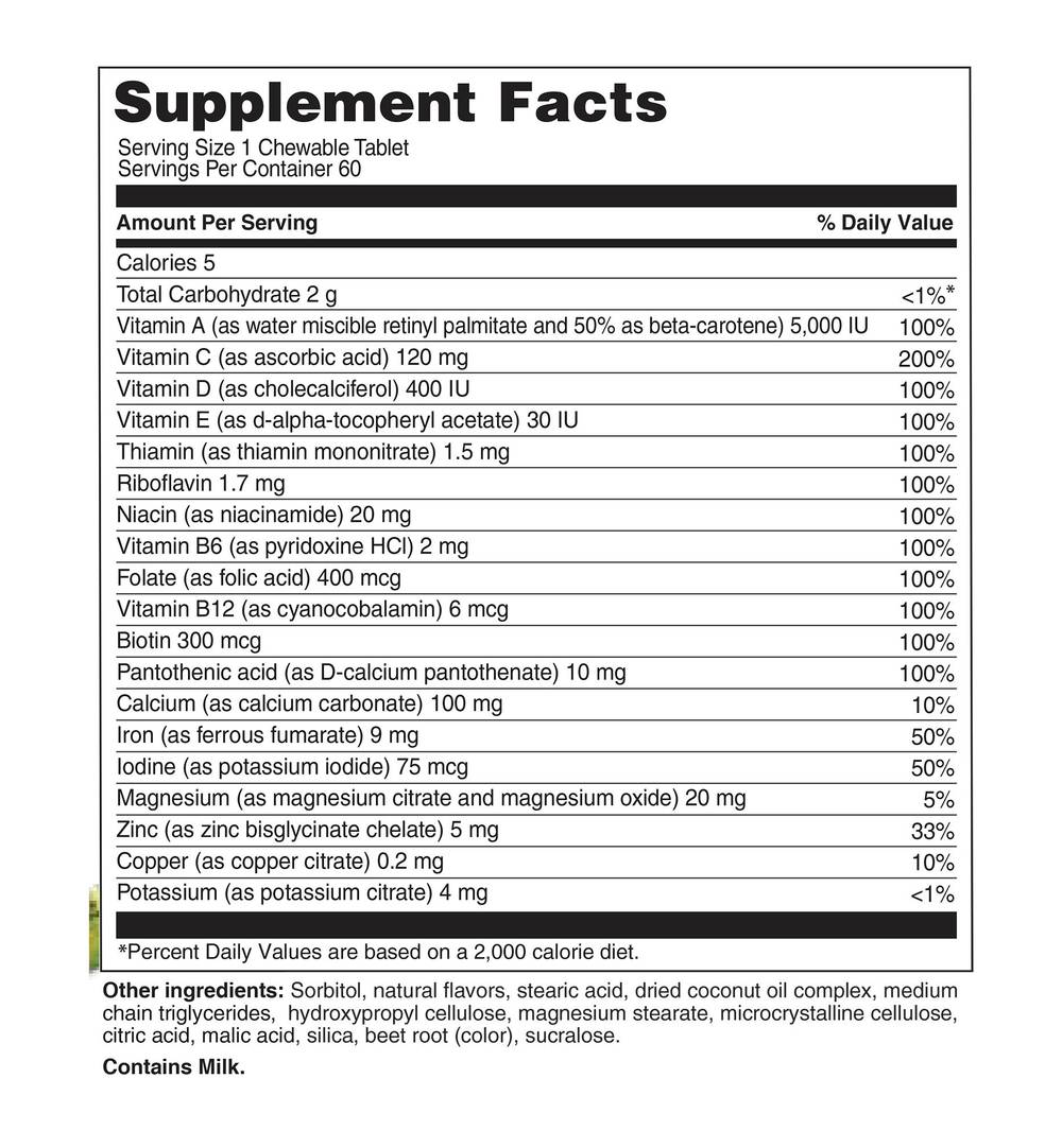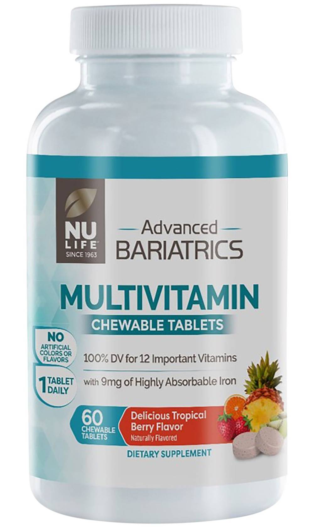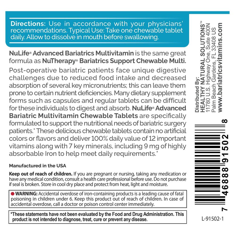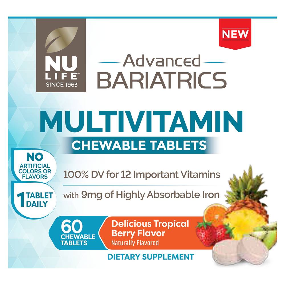 NuLife® Advanced Bariatrics Multivitamin is the same great formula as NuTherapy® Bariatrics Support Chewable Multi.Post-operative bariatric patients face unique digestive challenges due to reduced food intake and decreased absorption of several key micronutrients; this can leave them prone to certain nutrient deficiencies. Many dietary supplement forms such as capsules and regular tablets can be difficult for these individuals to digest and absorb. NuLife® Advanced Bariatric Multivitamin Chewable Tablets are specifically formulated to support the nutritional needs of bariatric surgery patients. These delicious chewable tablets contain no artificial colors or flavors and deliver 100% daily value of 12 important vitamins along with 7 key minerals, including 9 mg of highly absorbable Iron to help meet daily requirements.