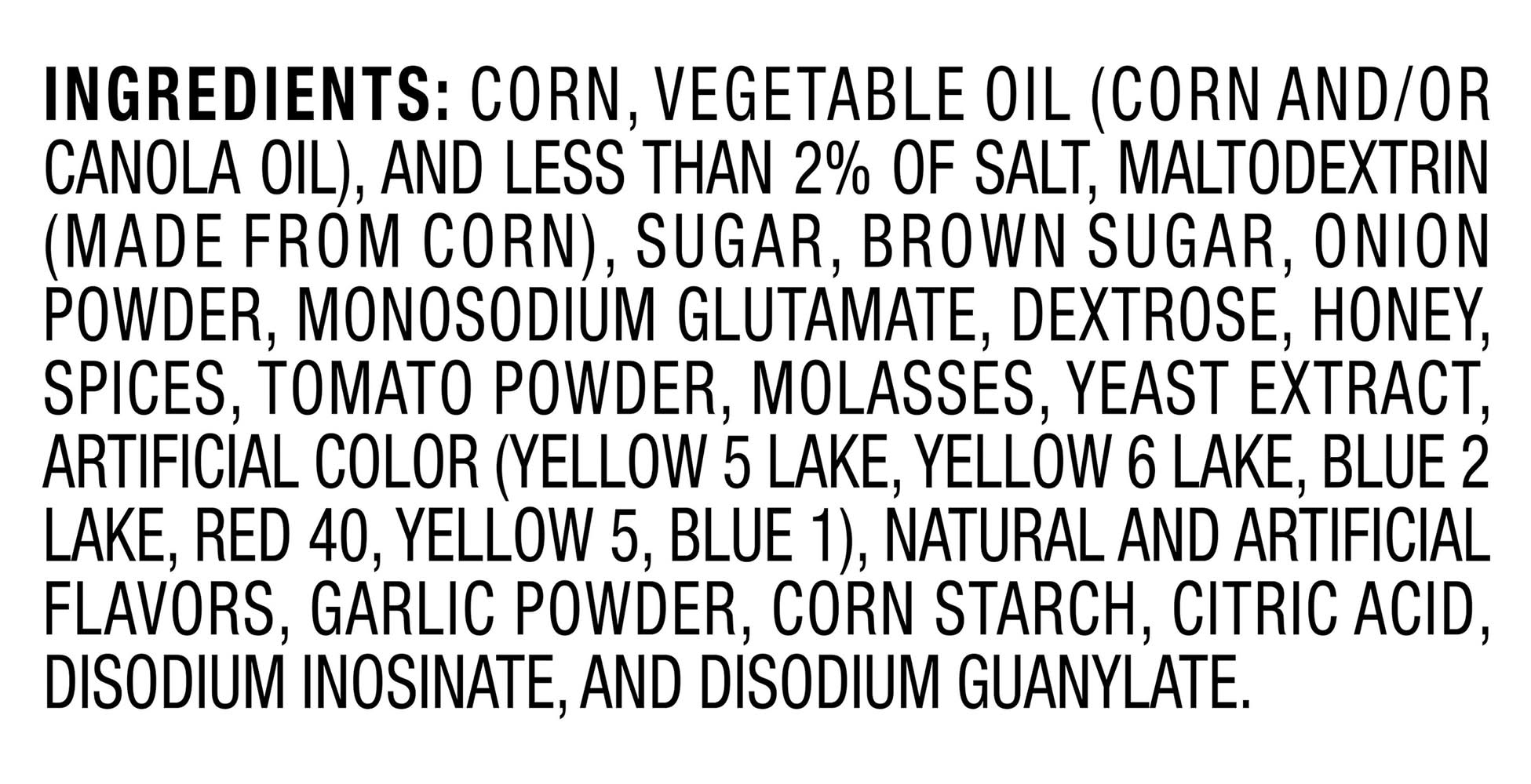 Ingredients: Corn, Vegetable Oil (Corn and/or Canola Oil), and Less than 2% of Salt, Maltodextrin (Made from Corn), Sugar, Brown Sugar, Onion Powder, Monosodium Glutamate, Dextrose, Honey, Spices, Tomato Powder, Molasses, Yeast Extract, Artificial Color (Yellow 5 Lake, Yellow 6 Lake, Blue 2 Lake, Red 40, Yellow 5, Blue 1), Natural and Artificial Flavors, Garlic Powder, Corn Starch, Citric Acid, Disodium Inosinate, and Disodium Guanylate Contains: Corn