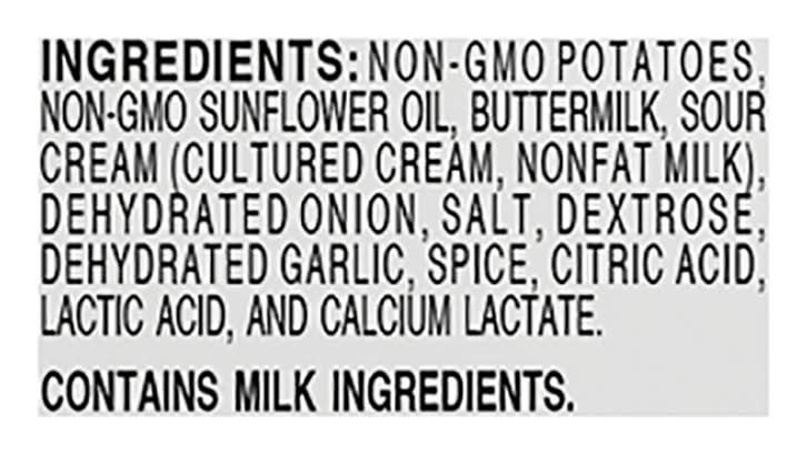 Ingredients: Non-GMO Potatoes, Non-GMO Sunflower Oil, Buttermilk, Sour Cream (Cultured Cream, Nonfat Milk), Dehydrated Onion, Salt, Dextrose, Dehydrated Garlic, Spice, Citric Acid, Lactic Acid, and Calcium Lactate