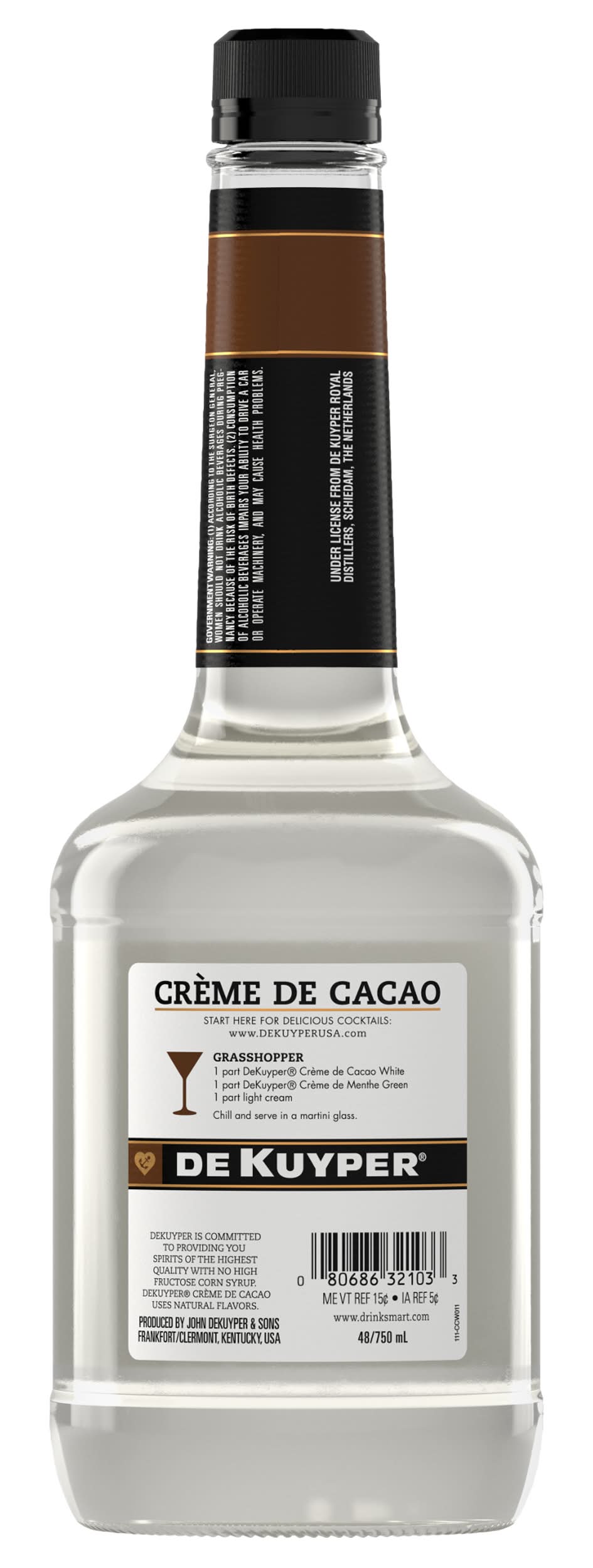 DeKuyper Crème de Cocoa White offers all the tempting taste of chocolate in an intensely flavored liqueur. Offering a rich nose of cocoa aroma with a hint of butter, this chocolate liqueur is an essential ingredient to rich, creamy cocktails. While this clear liqueur is slightly less bitter than its dark counterpart, its flavor is unmistakably sweet chocolate. Perfect for after-dinner cocktails, shake it up with ice, crème de menthe green and light cream for a colorful, refreshing Grasshopper Martini. With a heritage dating back more than 300 years, DeKuyper Cordials & Liqueurs continues to be on the cutting edge of the spirits industry. DeKuyper's evolution has been successful through the combination of its rich, traditional expertise and modern innovation, creating mixable and versatile cordials, liqueurs, crèmes, brandies and schnapps made from the world's finest ingredients. DeKuyper has been the brand bartenders trust to add color, flavor and fun to any cocktail. Alcohol by volume: 24%