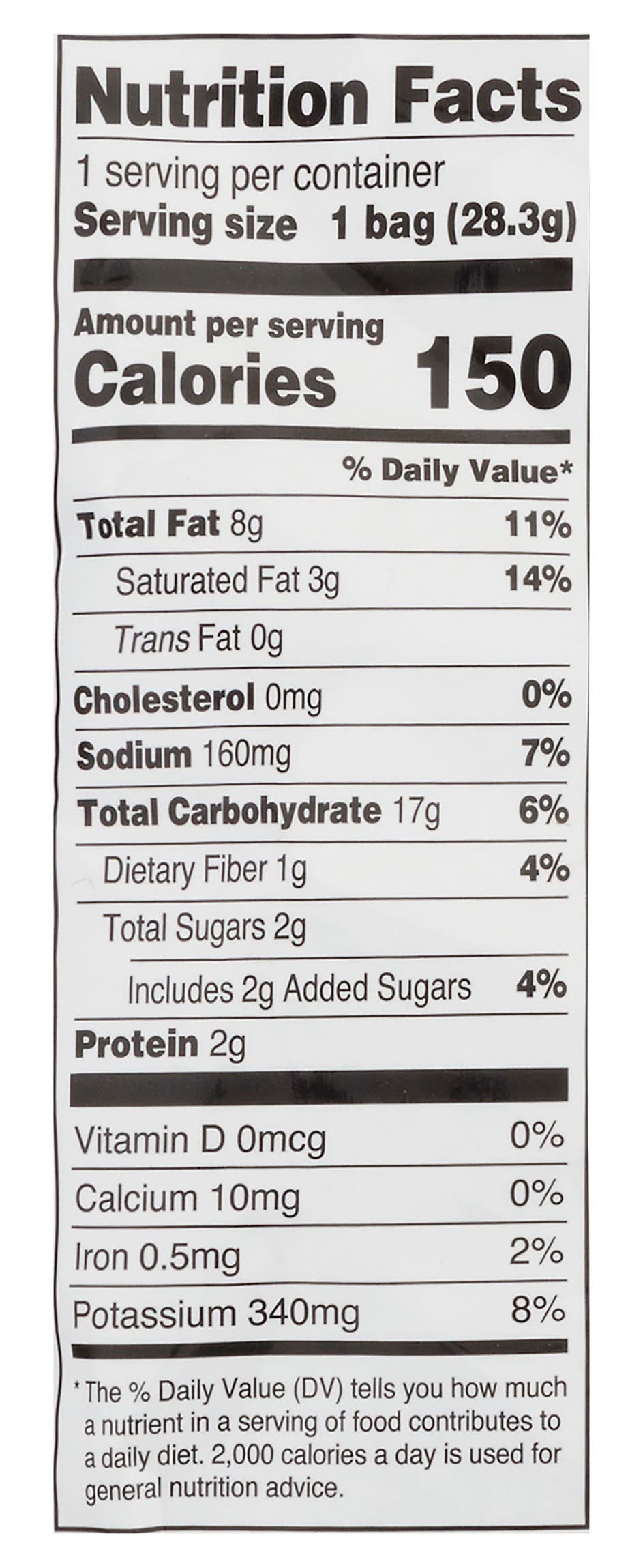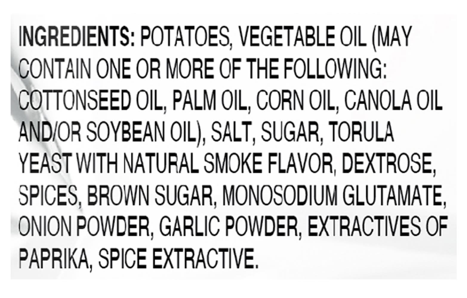 Ingredients: Potatoes, Vegetable Oil (May Contain One or More of the Following: Cottonseed Oil, Palm Oil, Corn Oil, Canola Oil and/or Soybean Oil), Salt, Sugar, Torula Yeast with Natural Smoke Flavor, Dextrose, Spices, Brown Sugar, Monosodium Glutamate, Onion Powder, Garlic Powder, Extractives of Paprika, Spice Extractive Contains: Corn, Soybeans