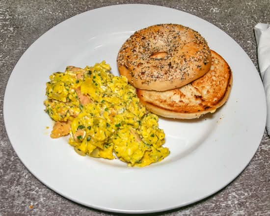 Three eggs scrambled with onions, fresh herbs, salmon and cream cheese. Served with a grilled bagel (plain, everything, sesame, cinnamon/raisin, or multi-grain)