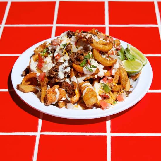 CHOICE OF PROTEIN, CURLY FRIES, QUESO, PICO, SOUR CREAM, QUESO FRESCO, CHEESE, CILANTRO