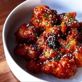 This vegan delight consists of crispy cauliflower florets cooked with fresh cut garlic, scallions and Indian herbs. It is Gluten free.