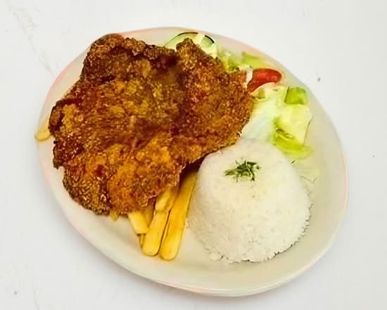 Breaded thinly sliced steak served with fries, salad, and rice.