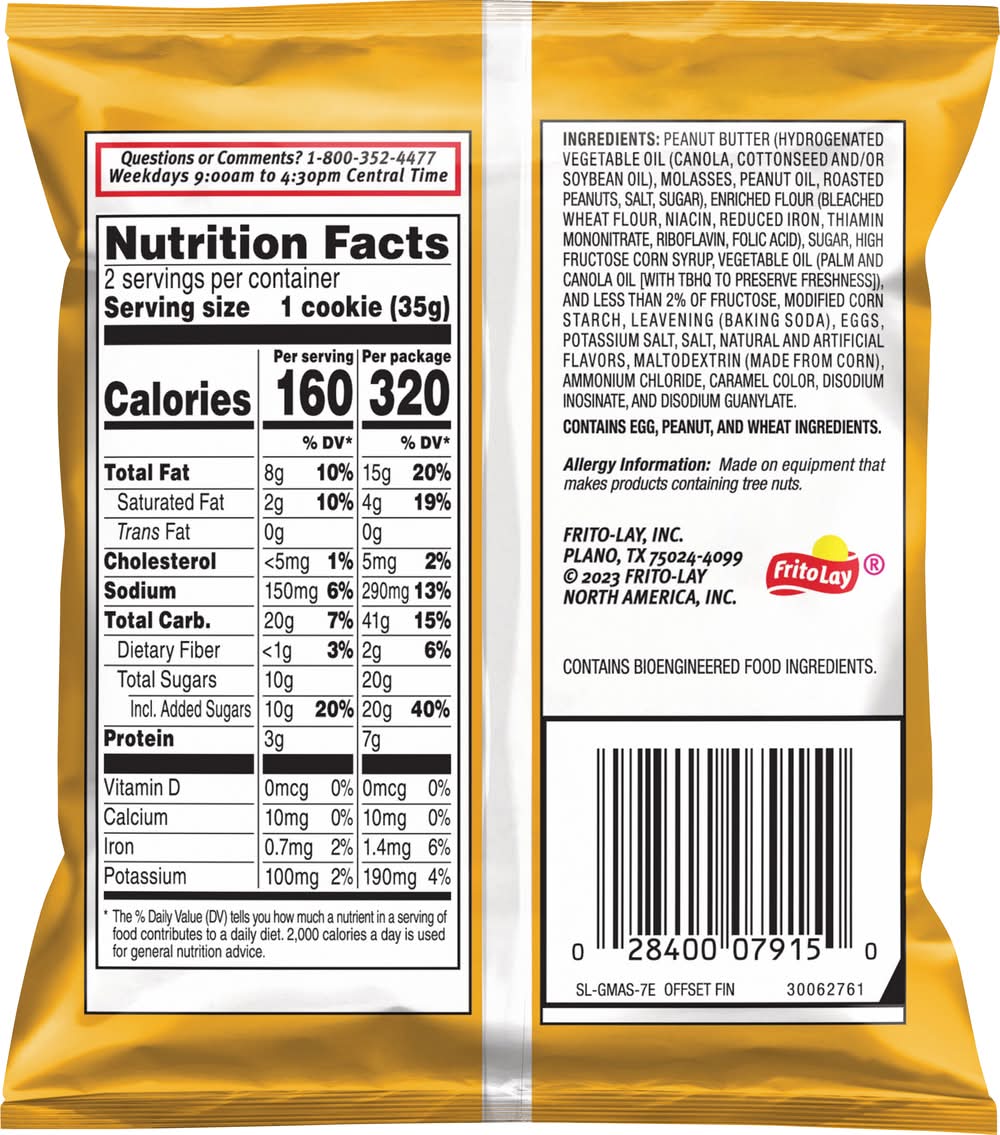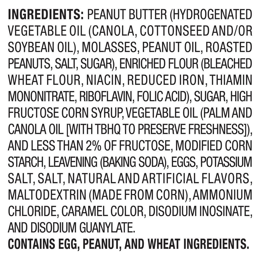 Ingredients: Peanut Butter (Hydrogenated Vegetable Oil (Canola, Cottonseed and/or Soybean Oil), Molasses, Peanut Oil, Roasted Peanuts, Salt, Sugar), Enriched Flour (Bleached Wheat Flour, Niacin, Reduced Iron, Thiamin Mononitrate, Riboflavin, Folic Acid), Sugar, High Fructose Corn Syrup, Vegetable Oil (Palm and Canola Oil [with TBHQ to Preserve Freshness]), and Less than 2% of Fructose, Modified Corn Starch, Leavening (Baking Soda), Eggs, Potassium Salt, Salt, Natural and Artificial Flavors, Maltodextrin (Made from Corn), Ammonium Chloride, Caramel Color, Disodium Inosinate, and Disodium Guanylate Contains: Eggs, Peanuts, Wheat, Corn, Tree Nuts, Soybeans