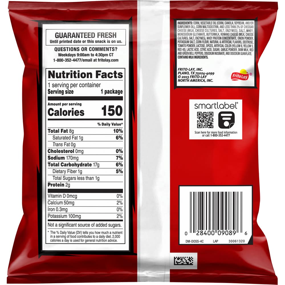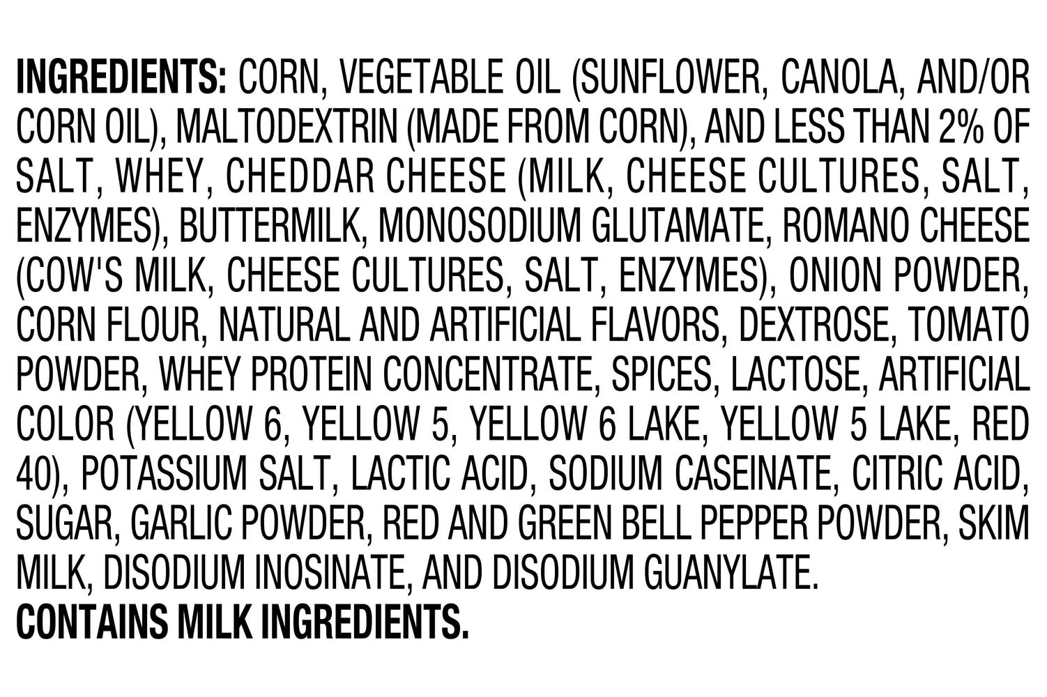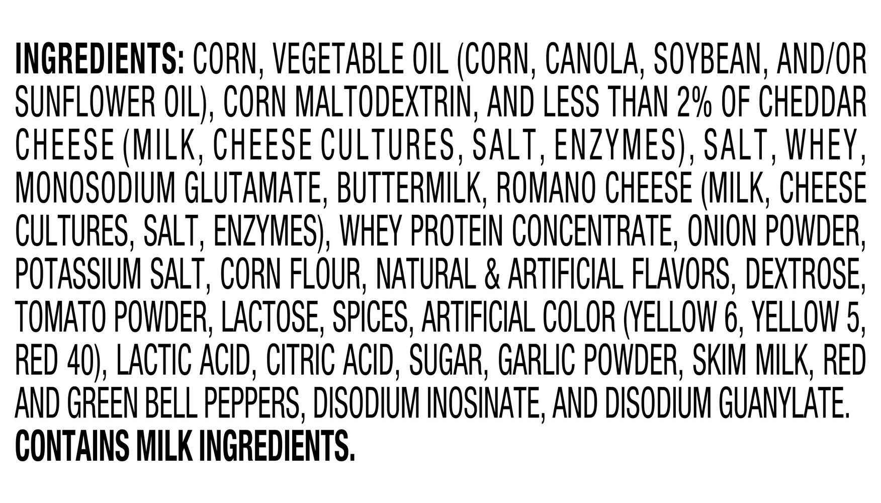 Ingredients: Corn, Vegetable Oil (Corn, Canola, Soybean, And/Or Sunflower Oil), Corn Maltodextrin, And Less Than 2% Of Cheddar Cheese (Milk, Cheese Cultures, Salt, Enzymes), Salt, Whey, Monosodium Glutamate, Buttermilk, Romano Cheese (Milk, Cheese Cultures, Salt, Enzymes), Whey Protein Concentrate, Onion Powder, Potassium Salt, Corn Flour, Natural Artificial Flavors, Dextrose, Tomato Powder, Lactose, Spices, Artificial Color (Yellow 6, Yellow 5, Red 40), Lactic Acid, Citric Acid, Sugar, Garlic Powder, Skim Milk, Red And Green Bell Peppers, Disodium Inosinate, And Disodium Guanylate. CONTAINS MILK INGREDIENTS. Contains: Milk, Corn, Lactose