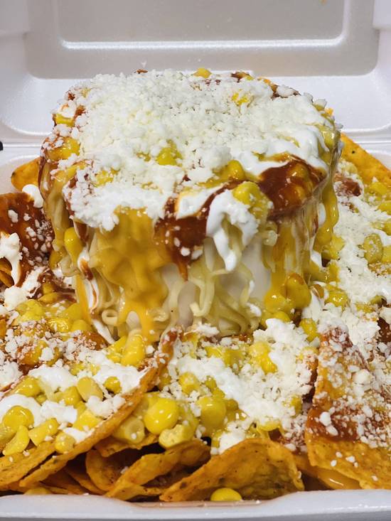 Maruchan con chips alrededor, queso de nacho, elote, crema, salsa picante y queso cotija. / ramen in a cup with chips around, nacho cheese, corn, sour cream, spicy sauce & cotija cheese.