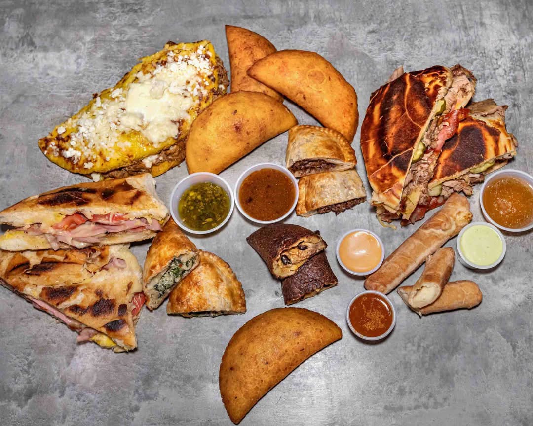 Share a box of 6 of our best selling empanadas. Try all of our empanada shells and a variety of fillings. Sorry no subs. Share a box of 6 of our best selling empanadas. Try all of our empanada shells and a variety of fillings. Sorry no subs. 1 Oxtail, 1 Chopped Cheese, 1 Papa y queso, 1 Pollo mole rojo, 1 Pabellon, 1 Pollo y quesoEmpanadas and Tequenos