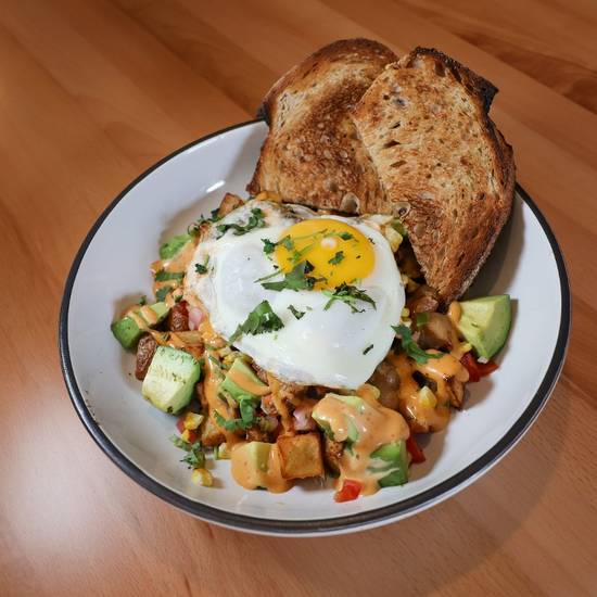 Breakfast potatoes, grilled corn, monterey jack cheese, avocado, pico de gallo, sunny side up egg, chipotle mayo drizzle served with sourdough on the side