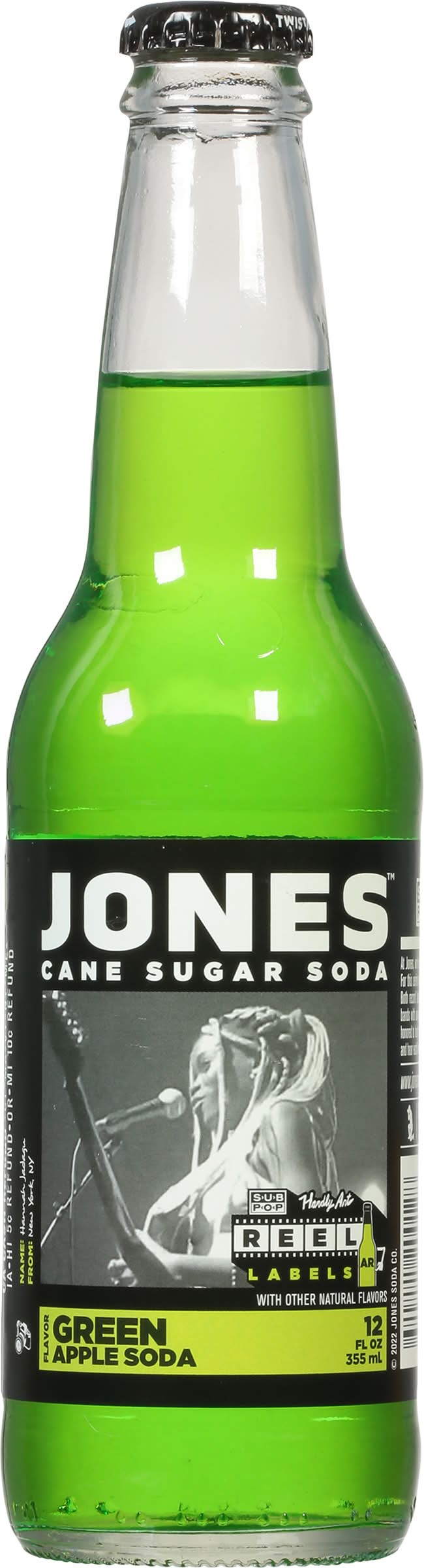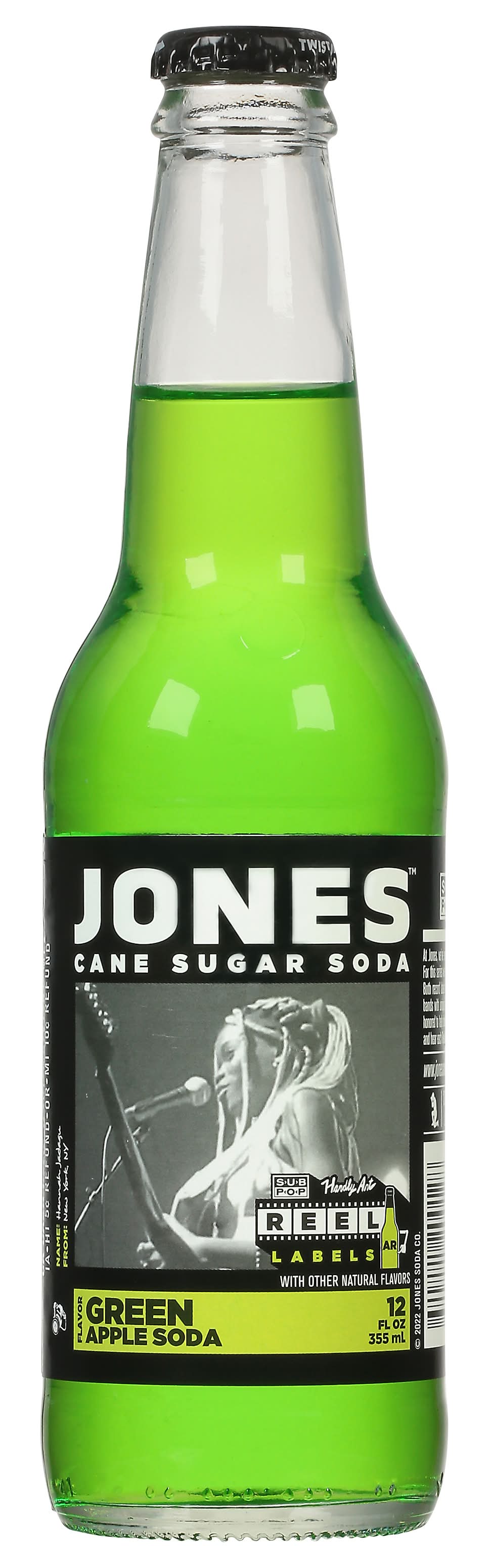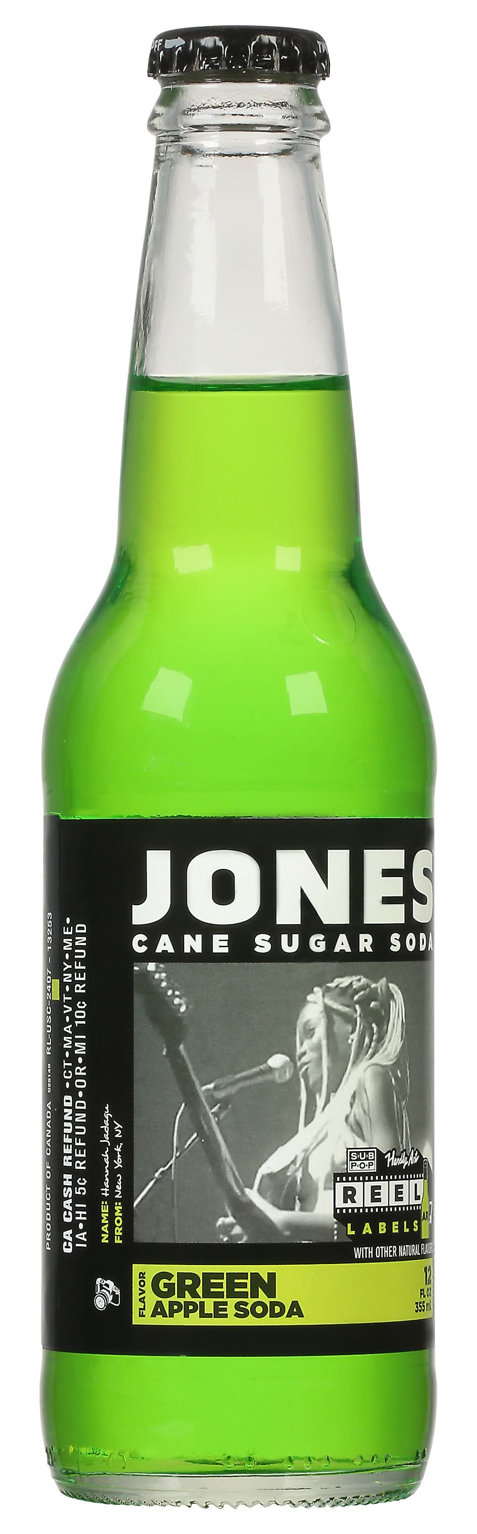 Cane Sugar Soda, Green Apple Flavor • Brand: Jones • kosher • Jones Soda Co., 66 S. Hanford St.Ste 150Seattle, WA, 98134 • Packaging: Reusable