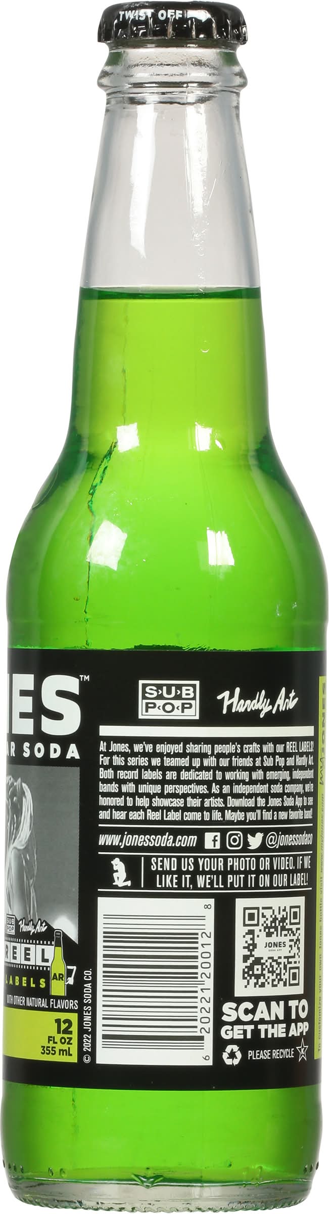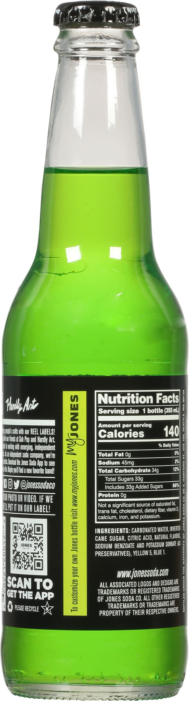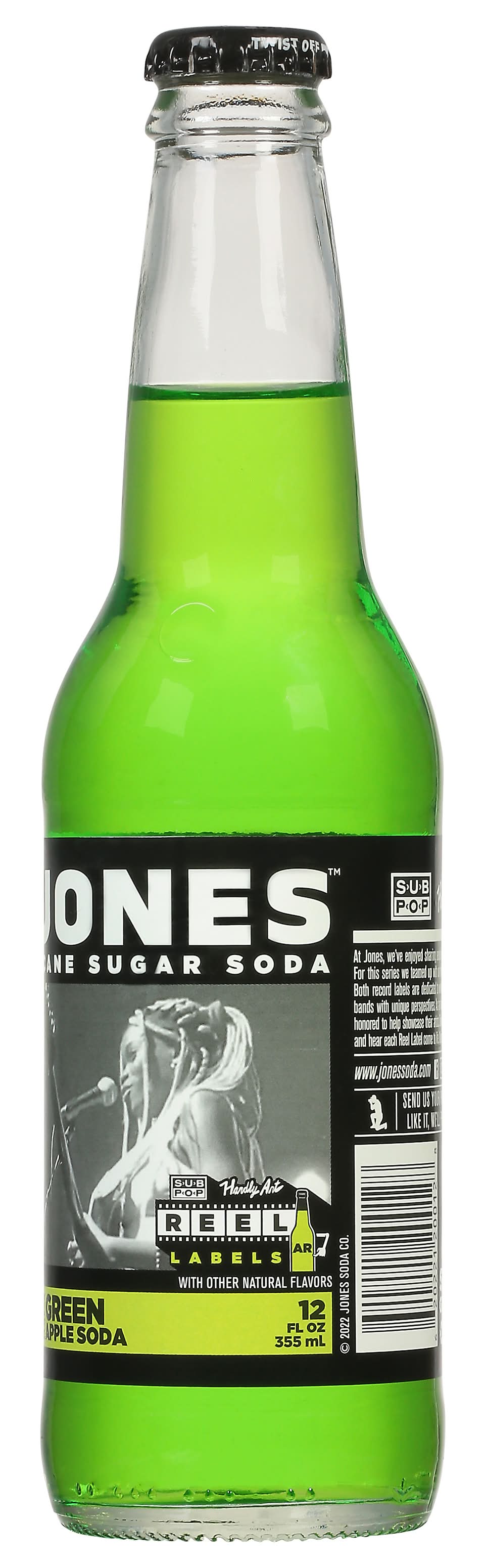 Cane Sugar Soda, Green Apple Flavor • Brand: Jones • kosher • Jones Soda Co., 66 S. Hanford St.Ste 150Seattle, WA, 98134 • Packaging: Reusable