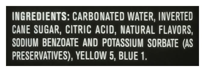 Ingredients: Carbonated Water, Inverted Cane Sugar, Citric Acid, Natural Flavors, Sodium Benzoate and Potassium Sorbate (as Preservatives), Yellow 5, Blue 1