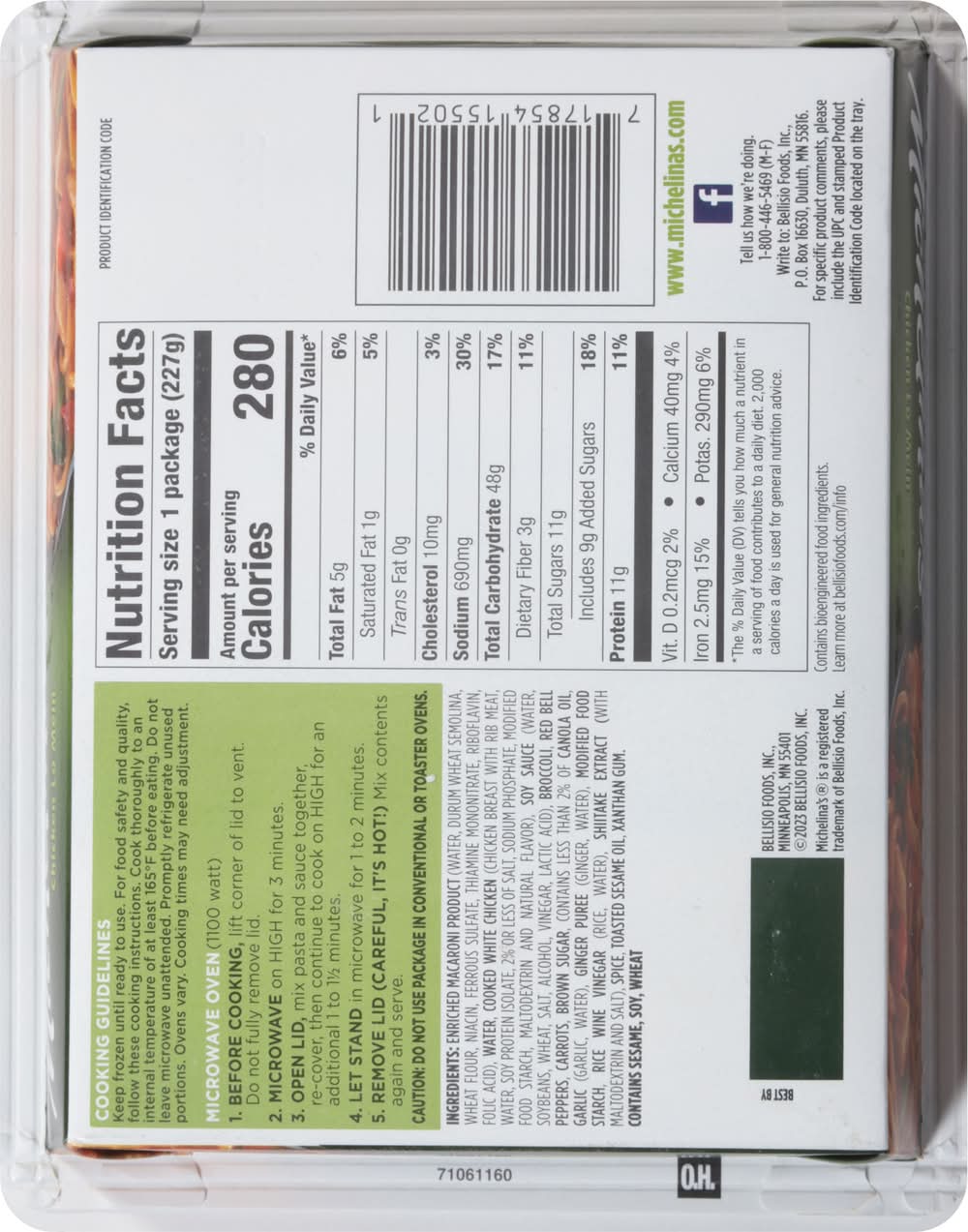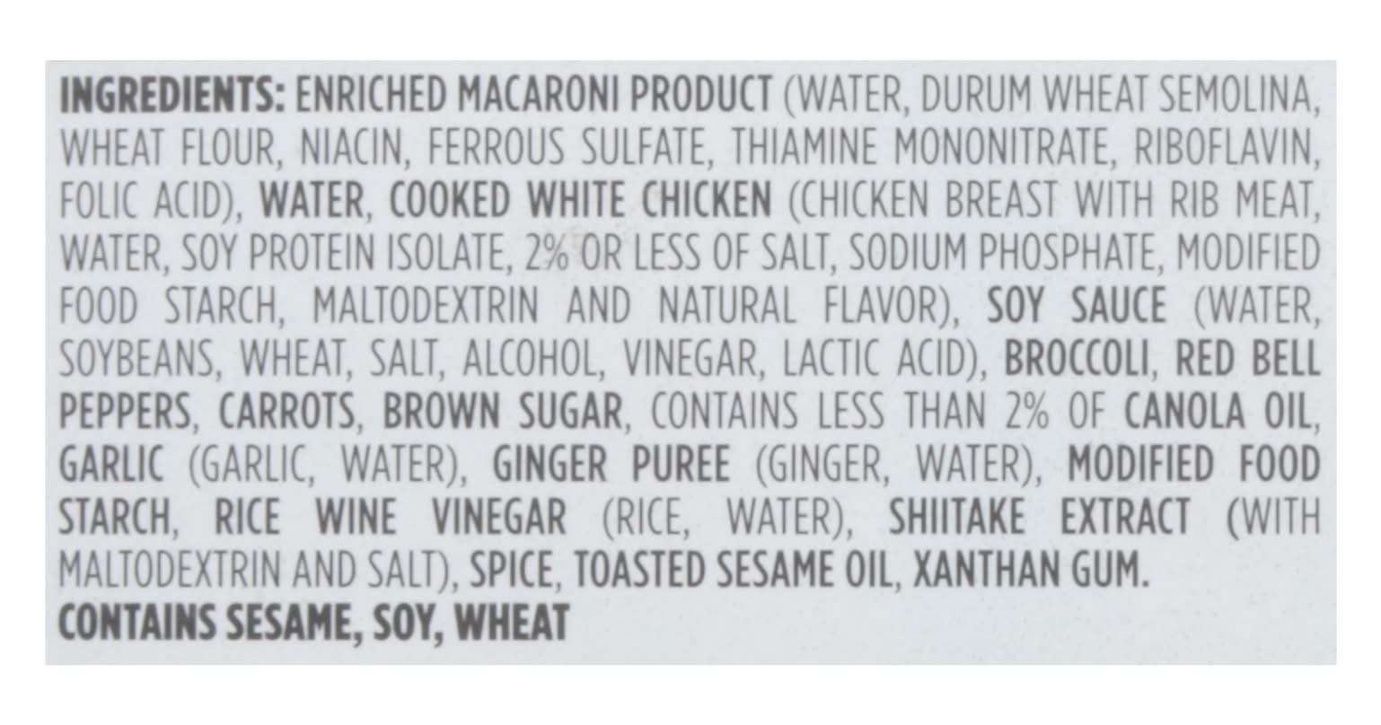 Ingredients: Enriched Macaroni Product (Water, Durum Wheat Semolina, Wheat Flour, Niacin, Ferrous Sulfate, Thiamine Mononitrate, Riboflavin, Folic Acid), Water, Cooked White Chicken (Chicken Breast with Rib Meat, Water, Soy Protein Isolate, 2% or Less of Salt, Sodium Phosphate, Modified Food Starch, Maltodextrin and Natural Flavor), Soy Sauce (Water, Soybeans, Wheat, Salt, Alcohol, Vinegar, Lactic Acid), Broccoli, Red Bell Peppers, Carrots, Brown Sugar, Contains Less than 2% of Canola Oil, Garlic (Garlic, Water), Ginger Puree (Ginger, Water), Modified Food Starch, Rice Wine Vinegar (Rice, Water), Shiitake Extract (with Maltodextrin and Salt), Spice, Toasted Sesame Oil, Xanthan Gum Contains: Sesame, Wheat, Soy