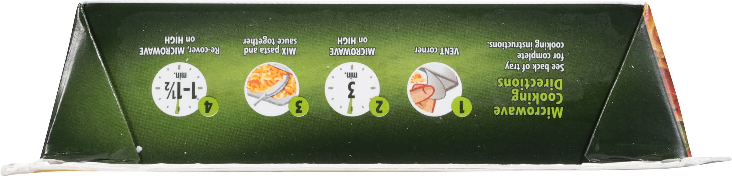 Directions for use: Cooking guidelines keep frozen until ready to use. For food safety and quality, follow these cooking instructions. Cook thoroughly to an internal temperature of at least 165°f before eating. Do not leave microwave unattended. Promptly refrigerate unused portions. Ovens vary. Cooking times may need adjustment. Microwave oven (1100 watt) 1. Before cooking, lift corner of lid to vent. Do not fully remove lid. 2. Microwave on high for 3 minutes. 3. Open lid, mix pasta and sauce together, re-cover, then continue to cook on high for an additional 1 to 1½ minutes. 4. Let stand in microwave for 1 to 2 minutes. 5. Remove lid (careful, it's hot!) Mix contents again and serve. Storage recommendation: Keep frozen.