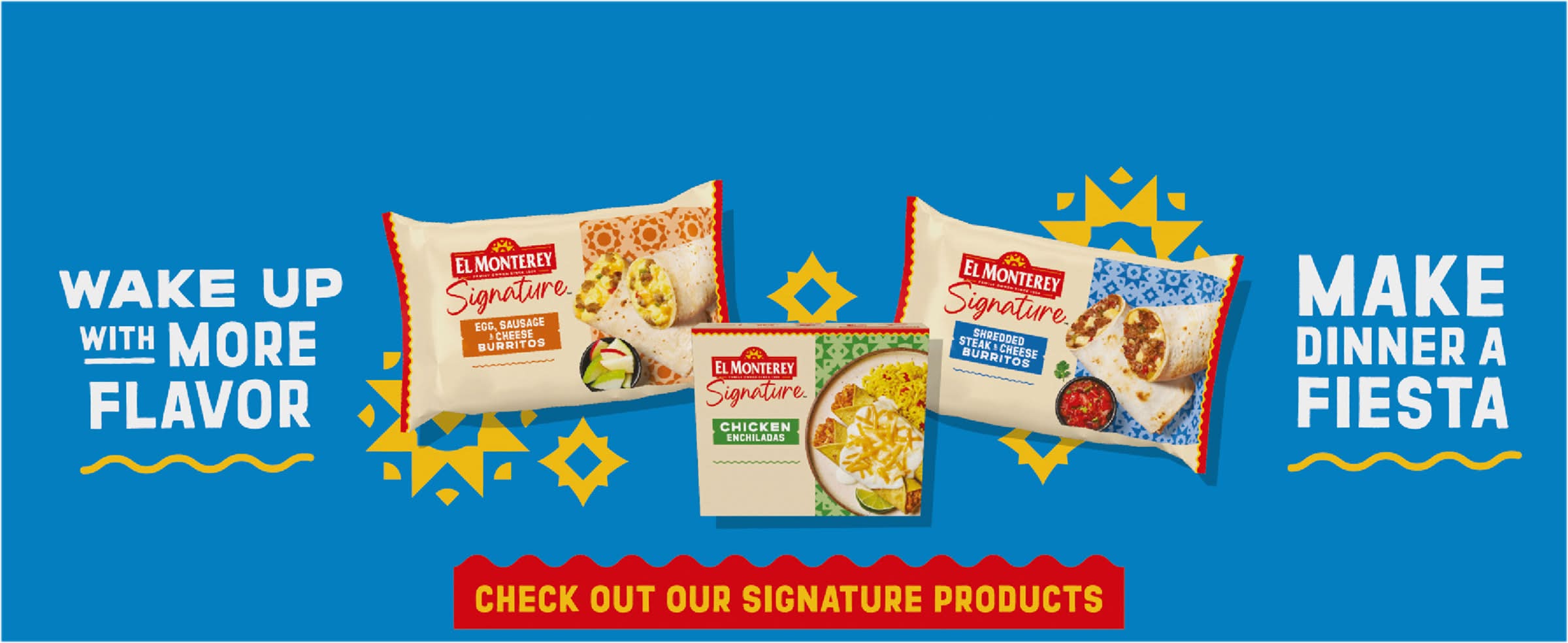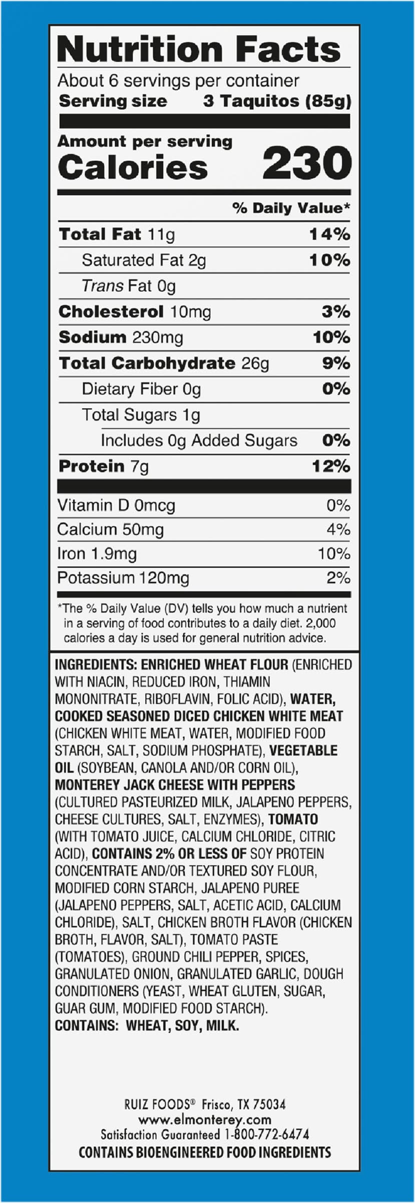 Get ready for a frickin' fiesta in your freezer! El Monterey Chicken & Cheese Taquitos are a dippable and delicious Mexican snack for family dinners, game days, movie nights, holiday parties, and more. These crowd-pleasing and host-friendly frozen taquitos heat up fast in the microwave or traditional oven but a few minutes in the air fryer really levels up the crispiness. Plus, with our new recipe, they're now packed with more cheese! Did we mention that kids love them? El Monterey Chicken & Cheese Taquitos make a convenient after-school snack – especially served with a side of salsa, guacamole, sour cream, or ranch. Of course, the party is just getting started when the crispy taquitos hit the table. El Monterey burritos and chimichangas, breakfast burritos, enchilada meals, and other frozen appetizers turn any social gathering into a frickin' fiesta. America's No. 1 flour taquito Cook & serve. Microwaveable. You Can Taste the Quality: delicious chicken; Monterey jack cheese; authentic spices; fresh-baked flour tortillas. • Ruiz Foods, PO Box 37, Dinuba, CA, 93618-0037 • Packaging: Reusable