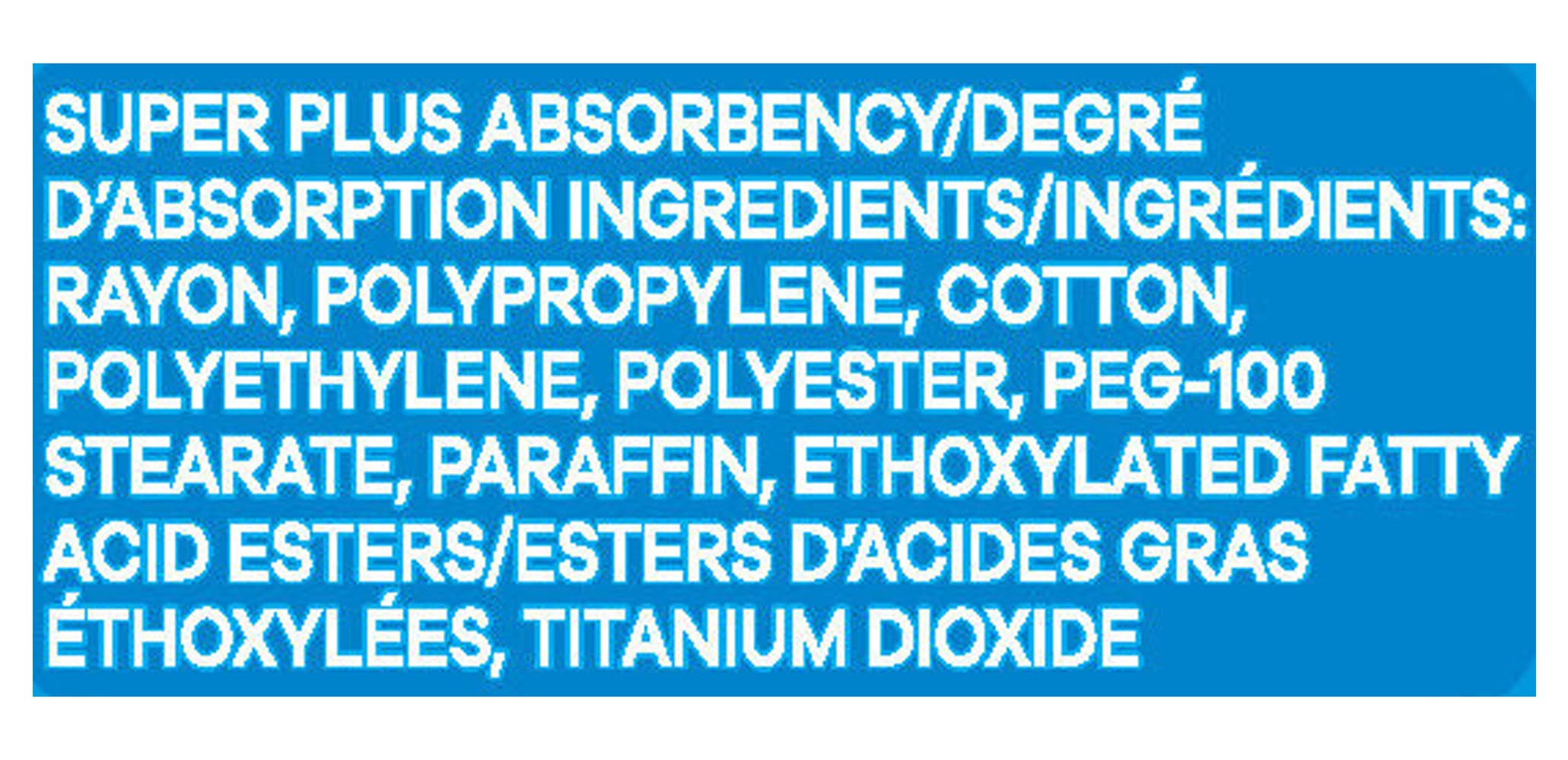 Ingredients: Rayon, Polypropylene, Cotton, Polyethylene, Polyester, PEG-100 Stearate, Paraffin, Ethoxylated Fatty Acid Esters/Esters D'acides Gras Ethoxylees, Titanium Dioxide