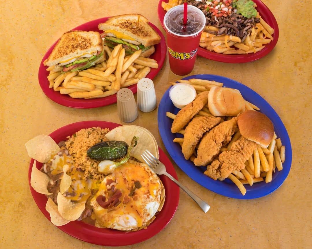 The most ordered items from Toms Jr are: CHKN STRP EXPRES, Burger Combo, Carne Asada Fries.