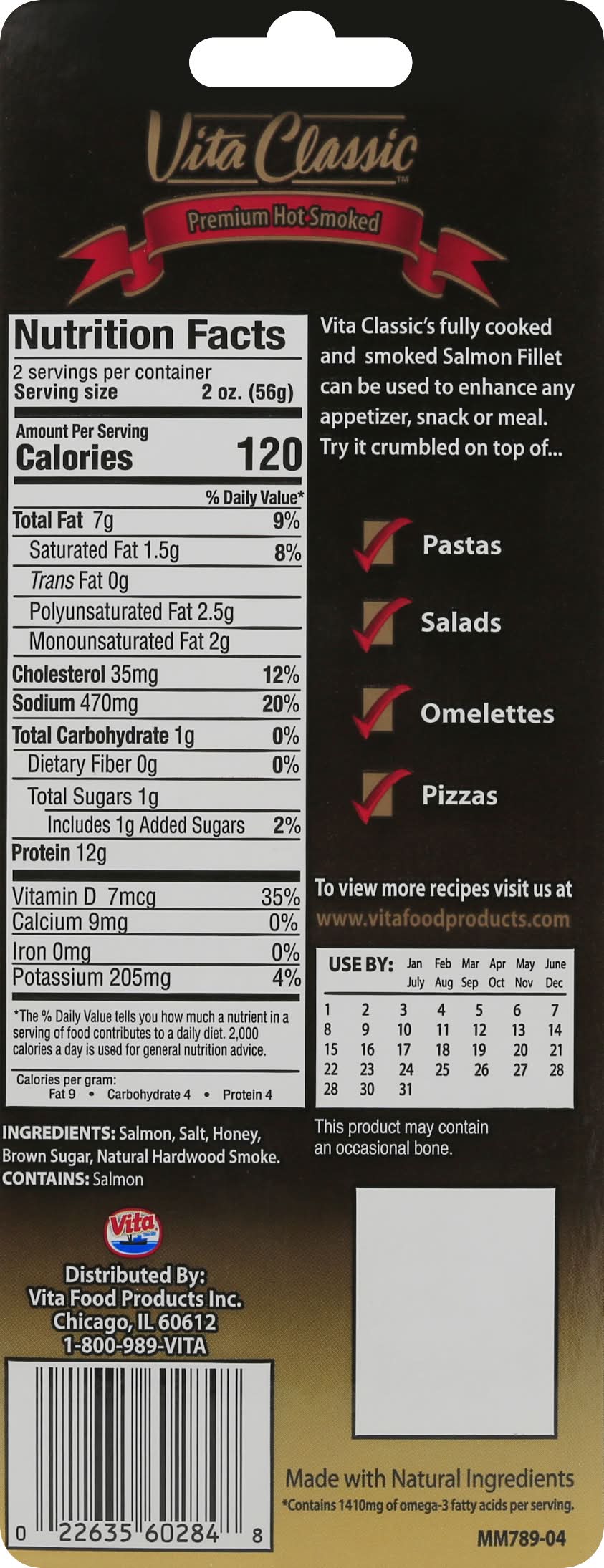 Salmon, Atlantic, Honey, Hot Smoked • Number of servings: 2 • VITA FOOD PRODUCTS, Chicago, IL, 60612, Ph: 800-989-VITA