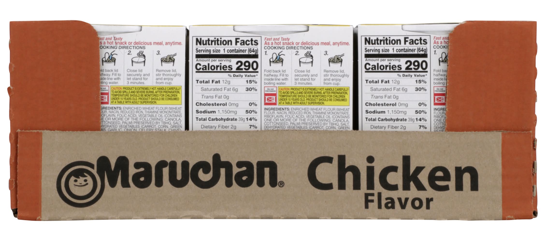 Features ramen noodles accompanied by vegetables, offering a quick and pleasant option for a hot snack or meal. It can be prepared in 3 minutes and contains 0 grams of trans fat. This product is made in the USA. • Flavor: Chicken • Pack size: 12
