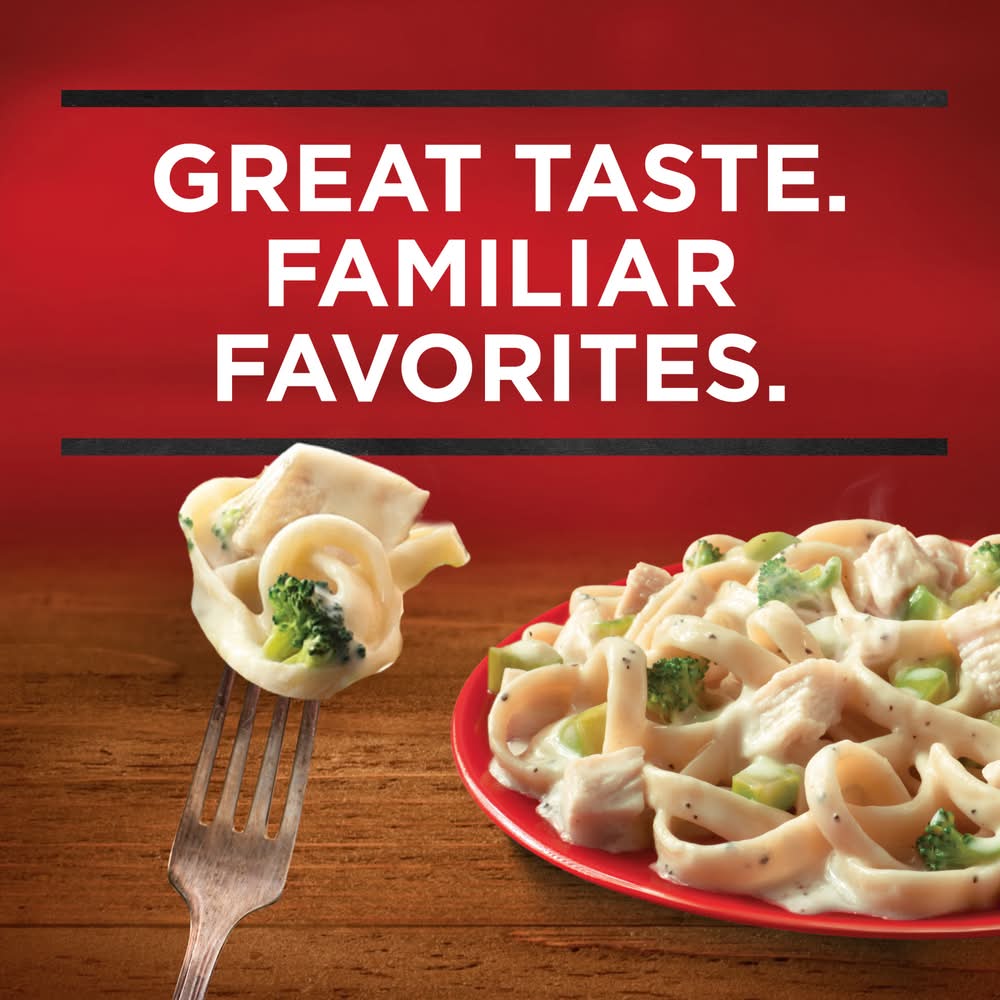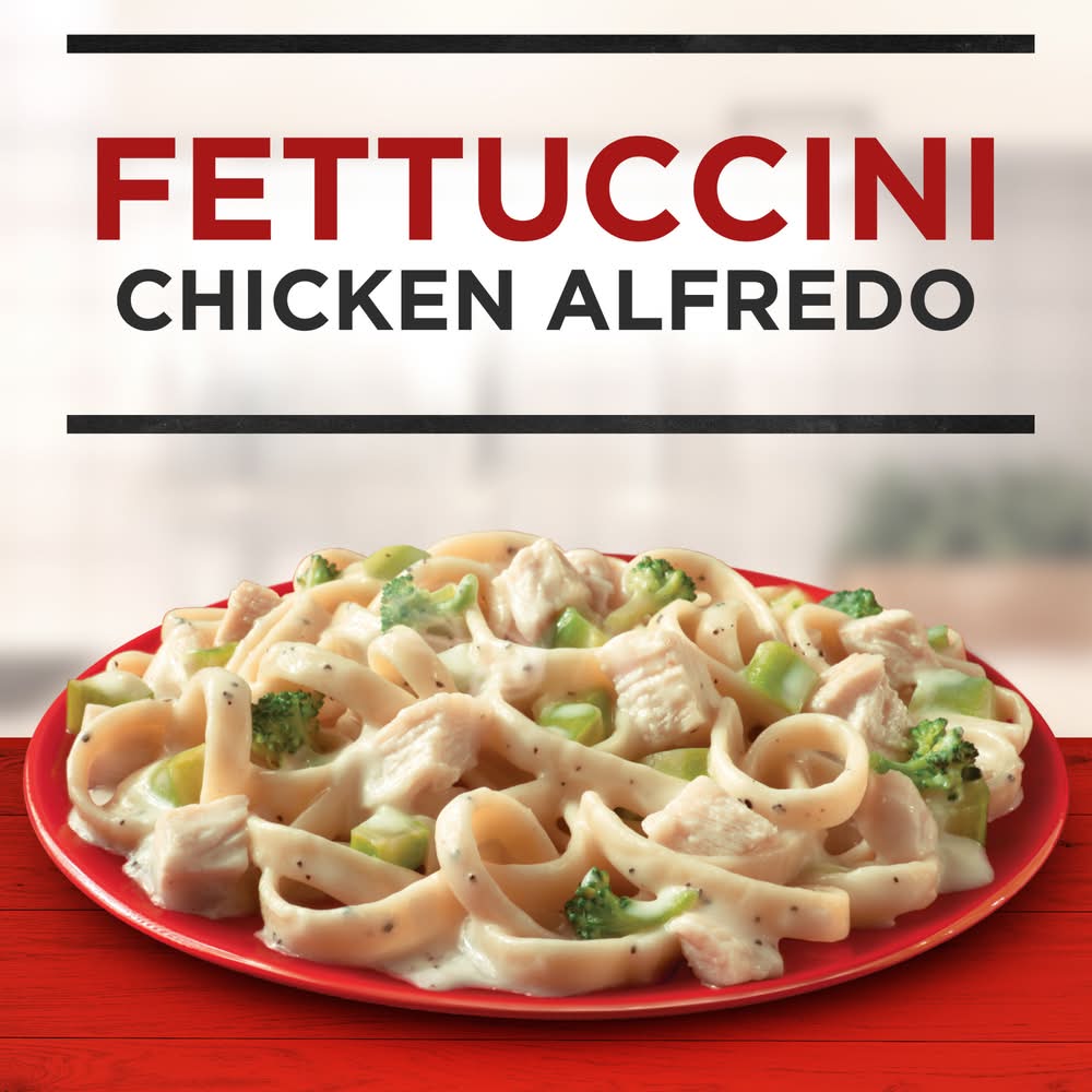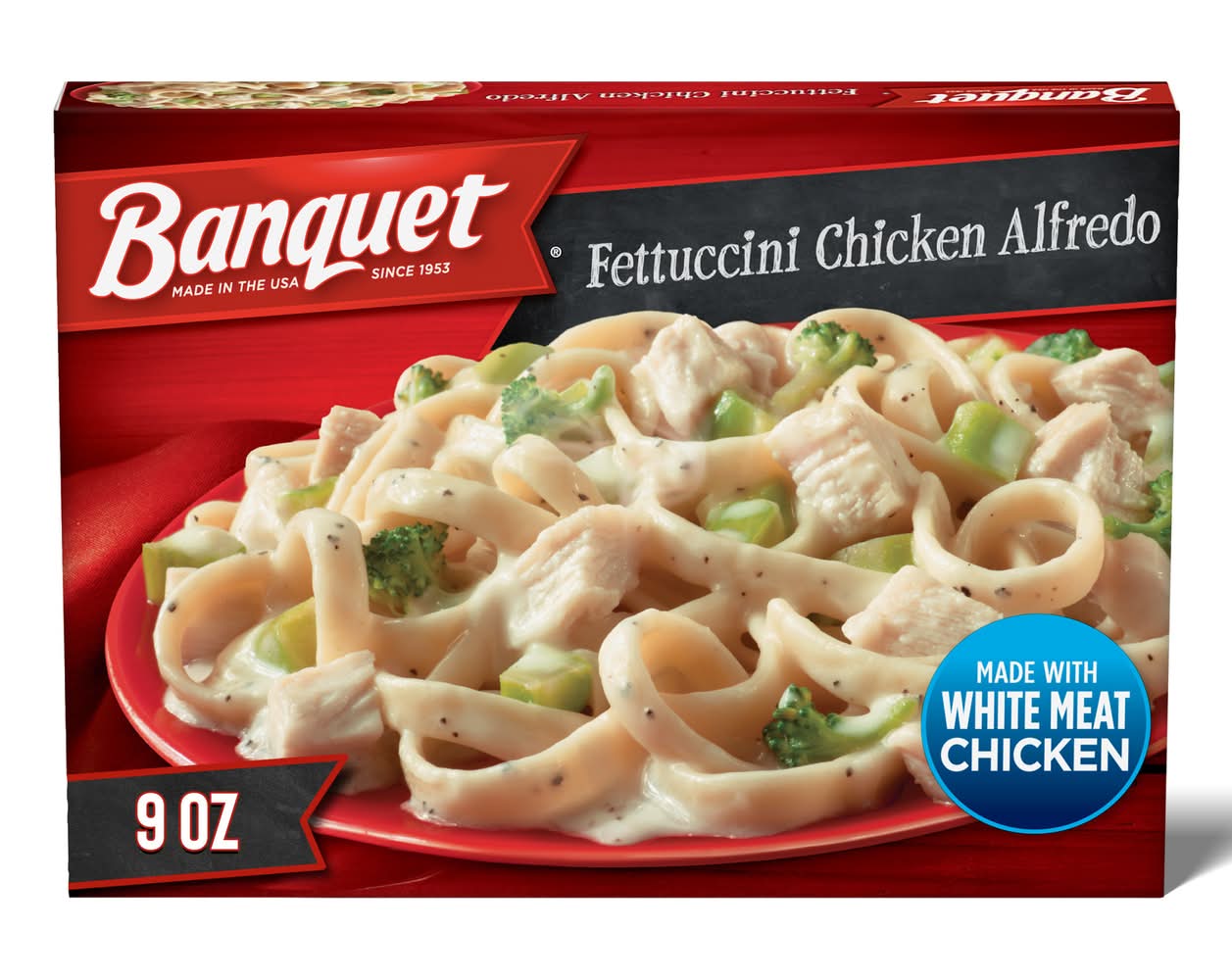 Banquet Fettuccini Chicken Alfredo frozen meal brings the home-cooked flavor to your table in minutes. This frozen dinner features white meat chicken, broccoli and fettuccini noodles with Alfredo sauce for delicious ready made meals. Enjoy Banquet frozen meals as convenient frozen lunches, or quick dinners when you're in the mood for noodles and Alfredo. Preparation of frozen prepared meals is quick and easy. Follow the instructions on the package to prepare frozen dinners in the oven for fresh-baked taste or microwave for a quicker cook time. Store the 9 ounce pasta meal in the freezer until you’re ready to enjoy frozen entrees. Proudly made in the U.S.A. for over 60 years, Banquet has been making delicious food the whole family loves. Packaging: Reusable