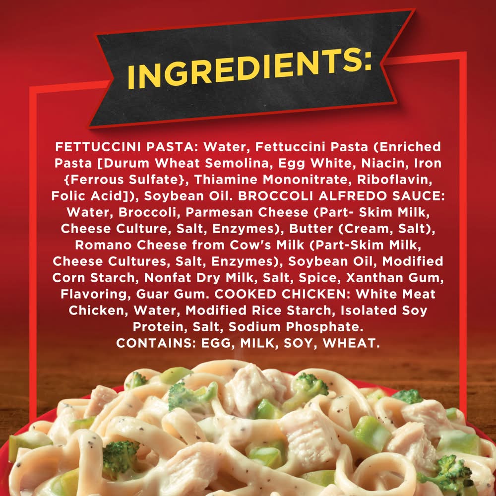Ingredients: Fettuccini Pasta: Water, Fettuccini Pasta Enriched Pasta [Durum Wheat Semolina, Egg White, Niacin, Iron {Ferrous Sulfate}, Thiamine Mononitrate, Riboflavin, Folic Acid], Soybean Oil, Broccoli Alfredo Sauce: Water, Broccoli, Parmesan Cheese Part-Skim Milk, Cheese Culture, Salt, Enzymes, Butter Cream, Salt, Romano Cheese from Cow's Milk Part-Skim Milk, Cheese Cultures, Salt, Enzymes, Soybean Oil, Modified Corn Starch, Nonfat Dry Milk, Salt, Flavorings, Xanthan Gum, Guar Gum, Citric Acid. Cooked Chicken: White Meat Chicken, Water, Modified Rice Starch, Isolated Soy Protein, Salt, Sodium Phosphate. Contains: 'Eggs Contains', 'Milk Contains', 'Soybeans Contains', 'Wheat Contains', 'Corn Contains'