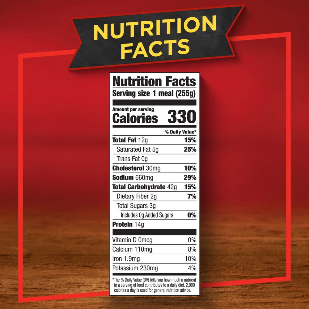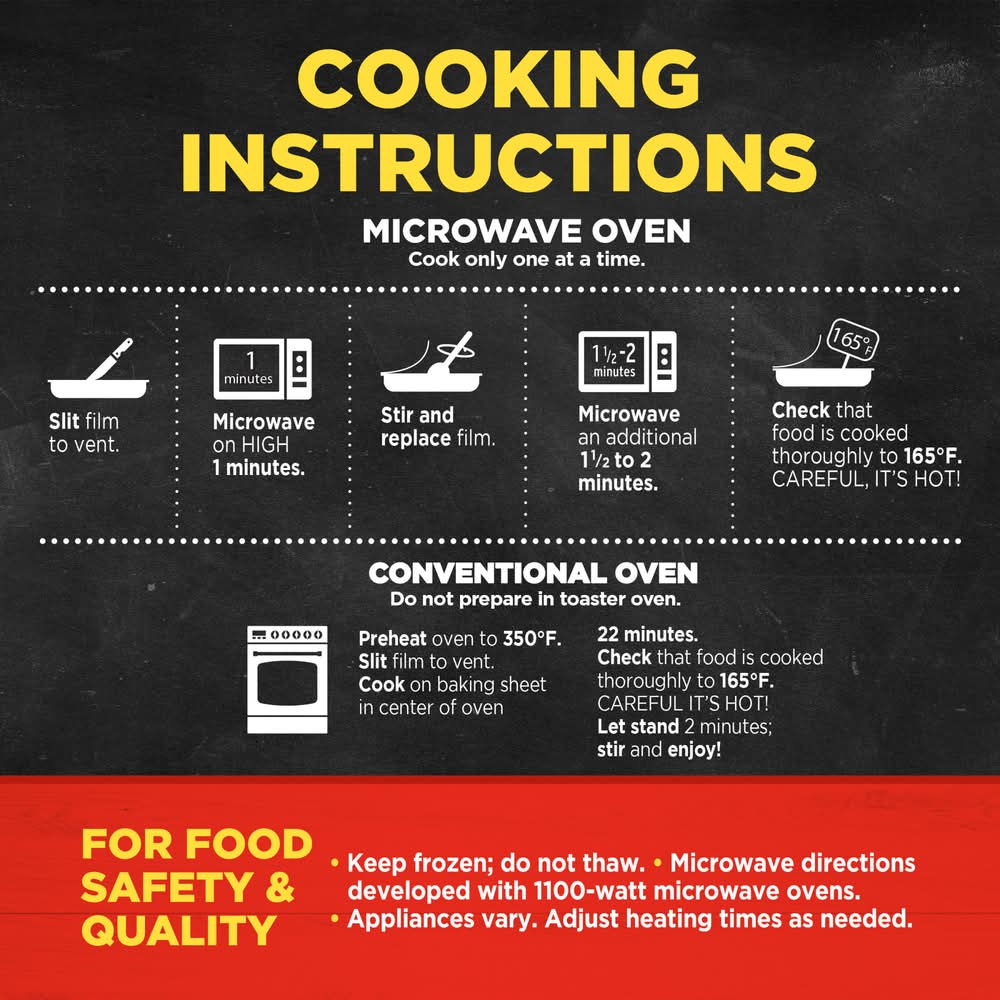 Directions for use: Microwave Oven: Cook only one at a time. Slit film to vent. Microwave on high 3 minutes. Stir and replace film. Microwave an additional 30 seconds to 1 minute. Check that food is cooked thoroughly to 165 degrees F. Careful, it’s hot! Let stand 2 minutes; Stir and enjoy! Conventional Oven: Do not prepare in toaster oven. Preheat oven to 350 degrees F. Slit film to vent. Cook on baking sheet in center of oven 32 to 34 minutes. Check that food is cooked thoroughly to 165 degrees F. Careful, it’s hot! Let stand 2 minutes; stir and enjoy! Must be cooked thoroughly. For Food Safety and Quality: Keep frozen. Do not thaw. Microwave directions developed with 1100-watt microwave ovens. Appliances vary. Adjust cooking times as needed. Food must be cooked thoroughly to 165 degrees F. Read and follow cooking directions. Keep frozen. Storage recommendation: Keep frozen.