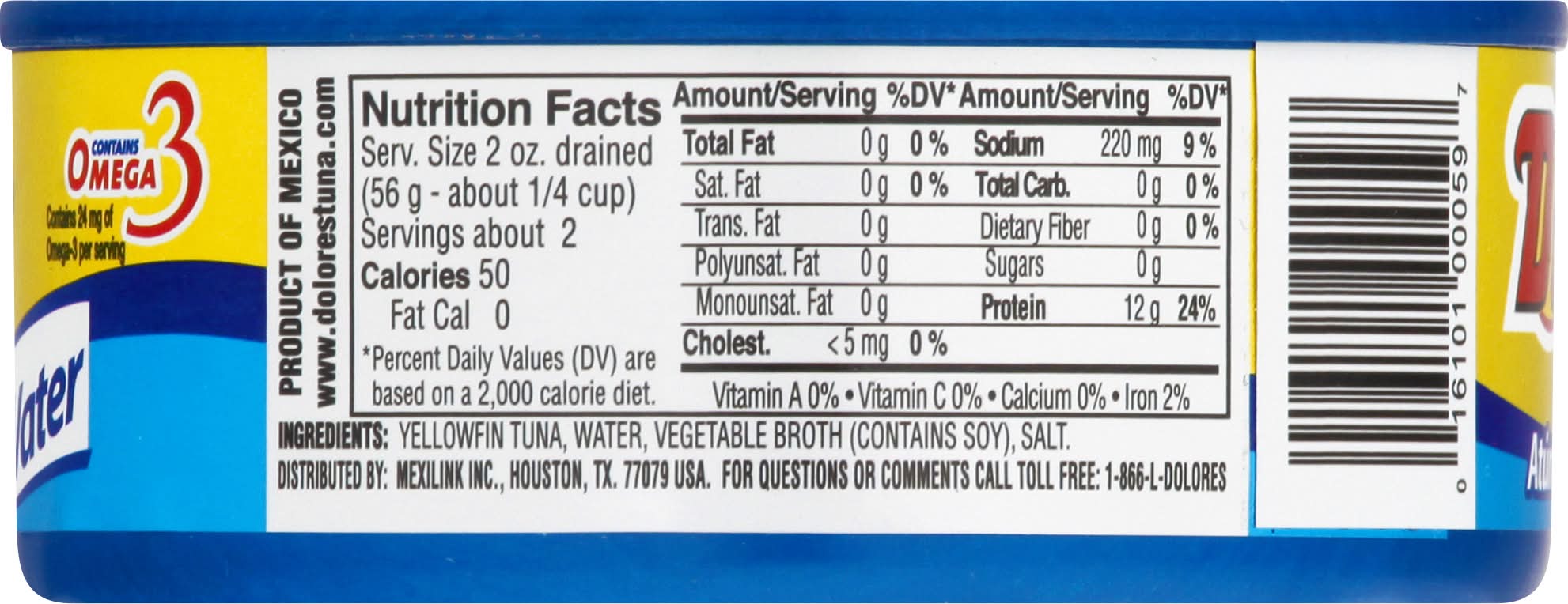 Ingredients: Yellowfin Tuna, Water, Vegetable Broth (Contains Soy), Salt Contains: Soybeans, Fish