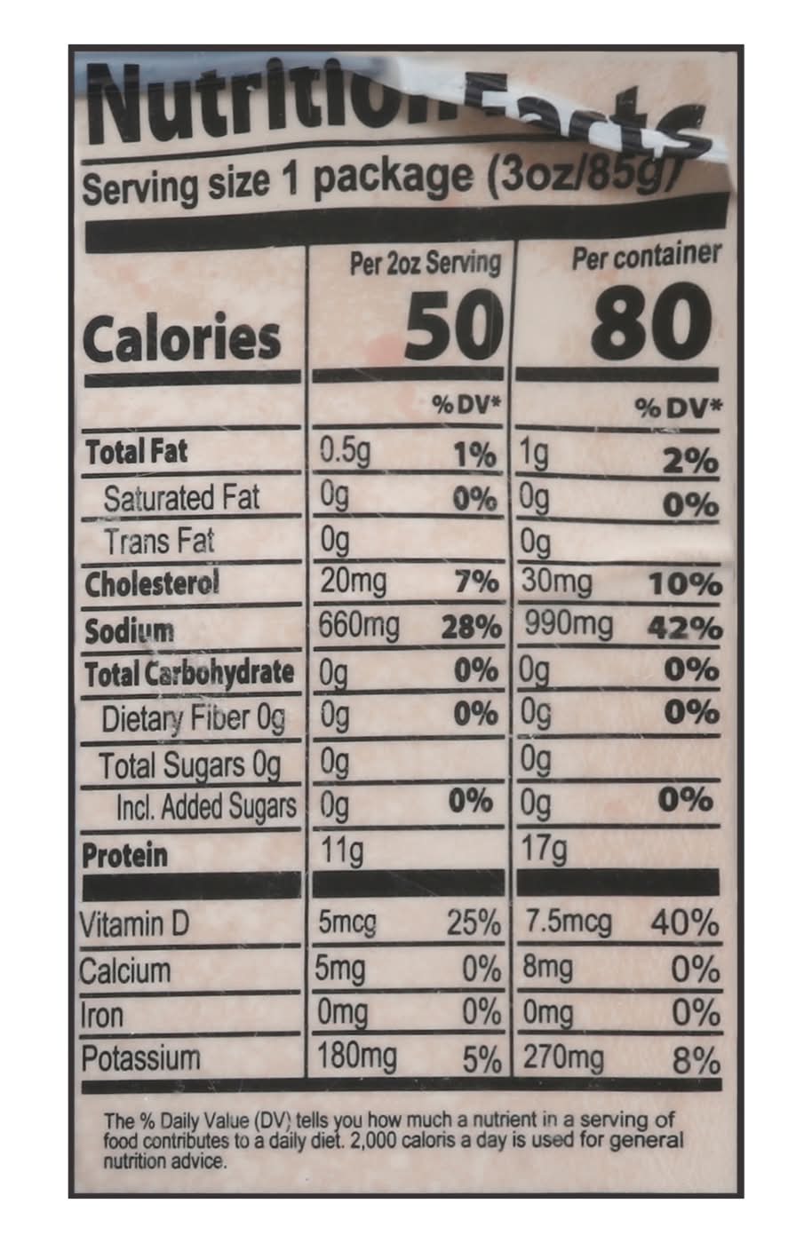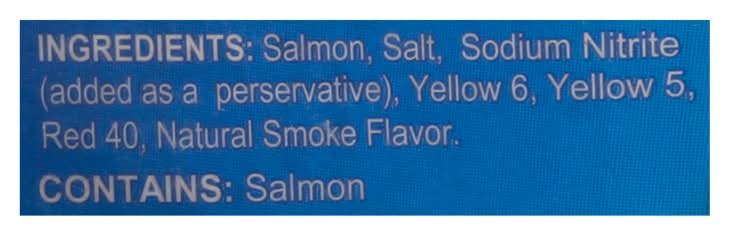 Ingredients: Salmon, Salt, Sugar, Sodium Nitrite (Added as a Preservative), Yellow 6, Yellow 5, Red 40, Natural Smoke Flavor Contains: Fish