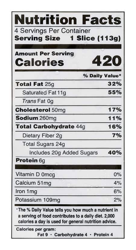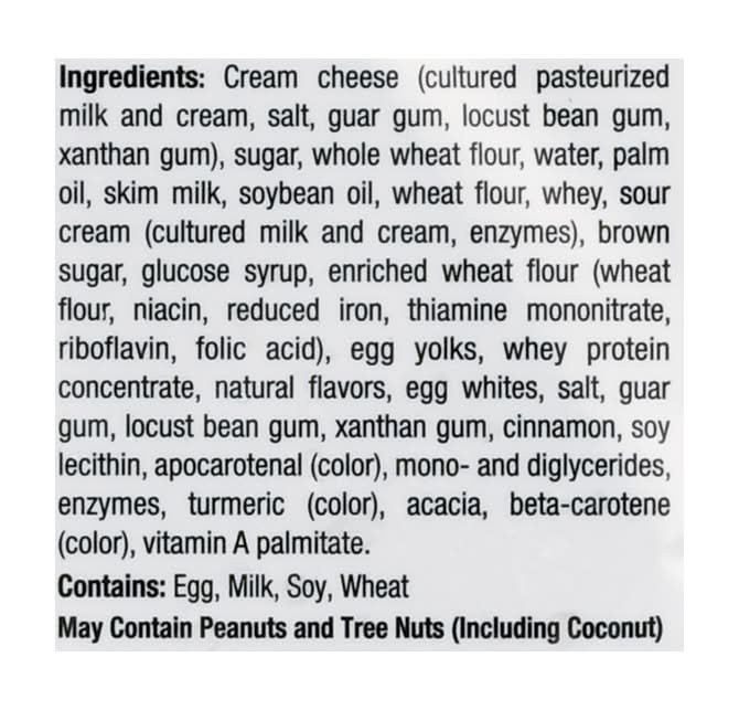 Ingredients: Cream Cheese (Cultured Pasteurized Milk and Cream, Salt, Guar Gum, Locust Bean Gum, Xanthan Gum), Sugar, Whole Wheat Flour, Water, Palm Oil, Skim Milk, Soybean Oil, Wheat Flour, Whey, Sour Cream (Cultured Milk and Cream, Enzymes), Brown Sugar, Glucose Syrup, Enriched Wheat Flour (Wheat Flour, Niacin, Reduced Iron, Thiamine Mononitrate, Riboflavin, Folic Acid), Egg Yolks, Whey Protein Concentrate, Natural Flavors, Egg Whites, Salt, Guar Gum, Locust Bean Gum, Xanthan Gum, Cinnamon, Soy Lecithin, Apocarotenal (Color), Mono-and Diglycerides, Enzymes, Turmeric (Color), Acacia, Beta-Carotene (Color), Vitamin A Palmitate Contains: Eggs, Milk, Soybeans, Wheat, Peanuts, Tree Nuts