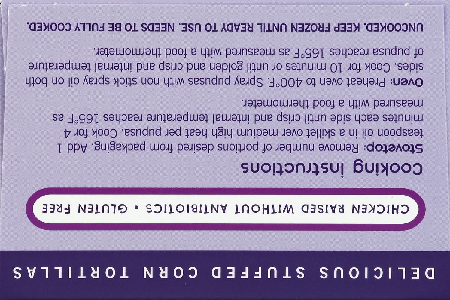 Directions for use: Keep frozen. Cooking Instructions: Stovetop: Remove number of portions desired from packaging. Add 1 teaspoon oil in a skillet over medium high heat per pupusa. Cook for 4 minutes each side until crisp and internal temperature reaches 165 degrees F as measured with a food thermometer. Oven: Preheat oven to 400 degrees F. Spray pupusas with non stick spray oil on both sides. Cook for 10 minutes or until golden and crisp and internal temperature of pupusa reaches 165 degrees F as measured with a food thermometer. Uncooked. Keep frozen until ready to use. Needs to be fully cooked. Storage recommendation: Keep frozen