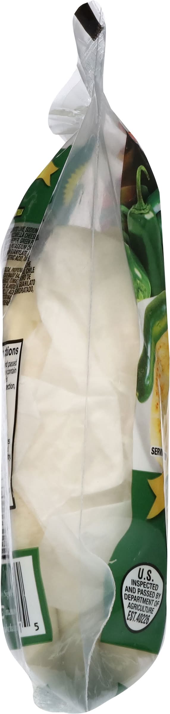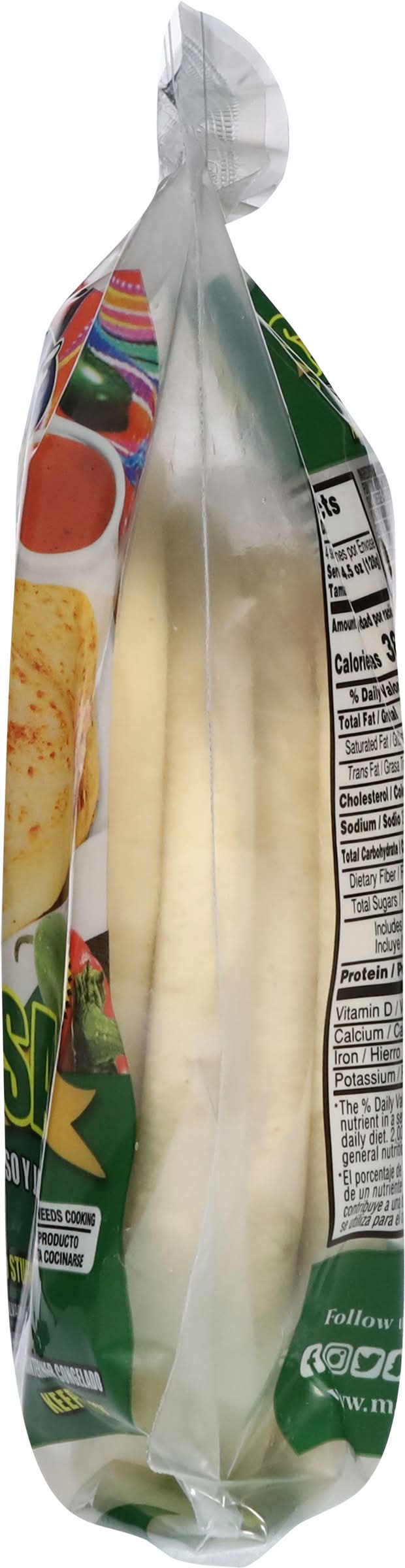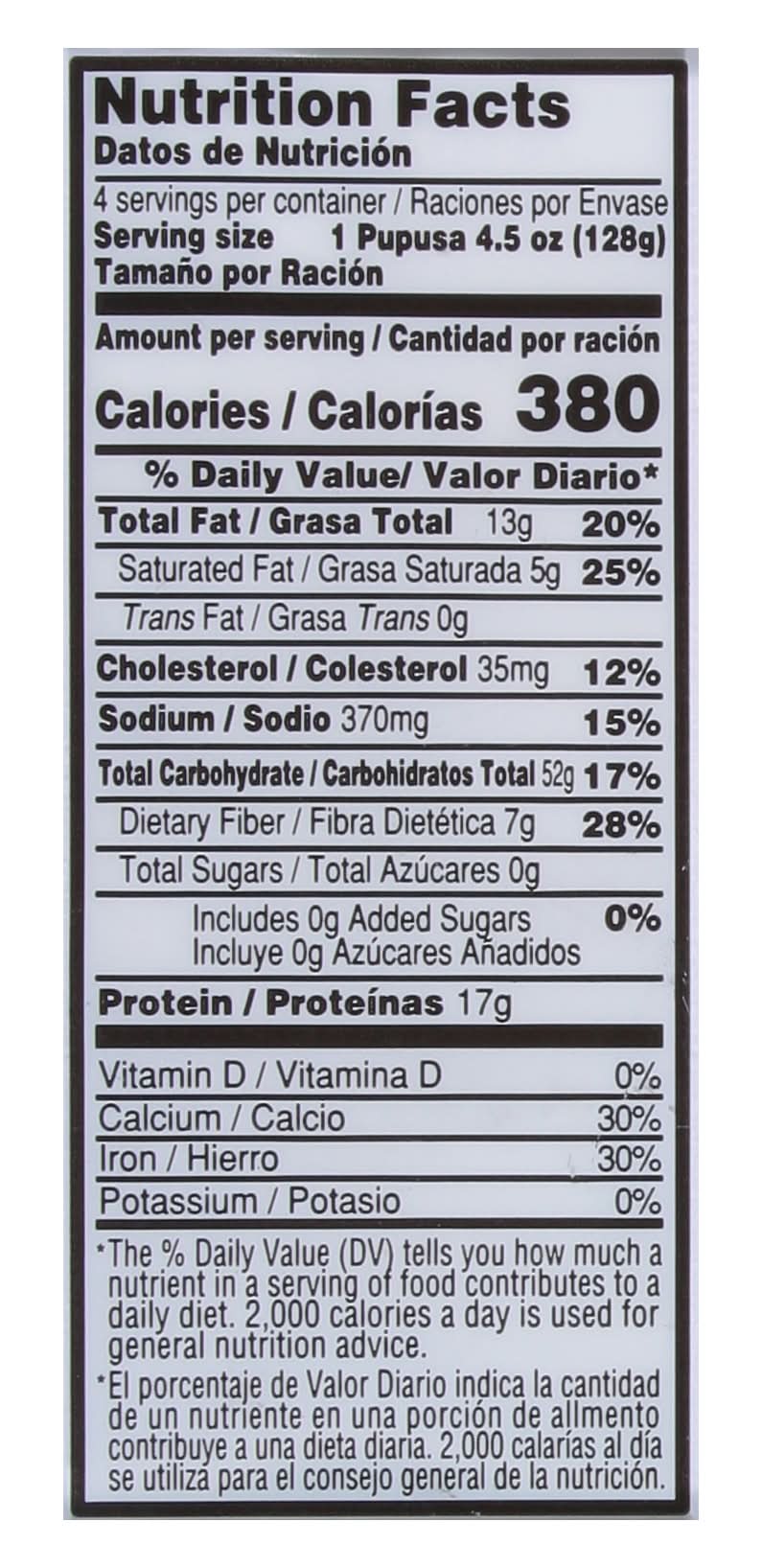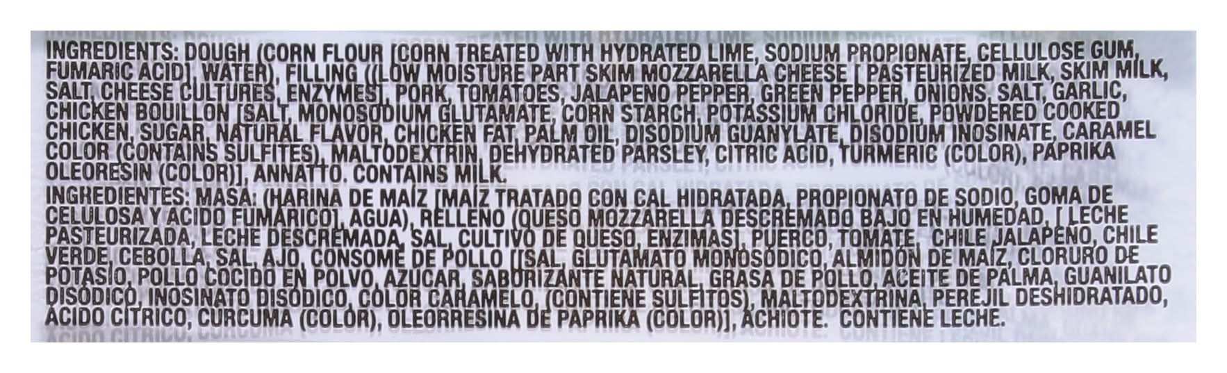 Ingredients: Dough (Corn Flour [Corn Treated with Hydrated Lime, Sodium Propionate, Cellulose Gum, Fumaric Acid], Water), Filling ((Low Moisture Part Skim Mozzarella Cheese [Pasteurized Milk, Skim Milk, Salt, Cheese Cultures, Enzymes], Pork, Tomatoes, Jalapeno Pepper, Green Pepper, Onions, Salt, Garlic, Chicken Bouillon [Salt, Monosodium Glutamate, Corn Starch, Potassium Chloride, Powdered Cooked Chicken, Sugar, Natural Flavor, Chicken Fat, Palm Oil, Disodium Guanylate, Disodium Inosinate, Caramel Color (Contains Sulfites), Maltodextrin, Dehydrated Parsley, Citric Acid, Turmeric (Color), Paprika Oleoresin (Color)], Annatto Contains: Milk, Corn, Sulfites