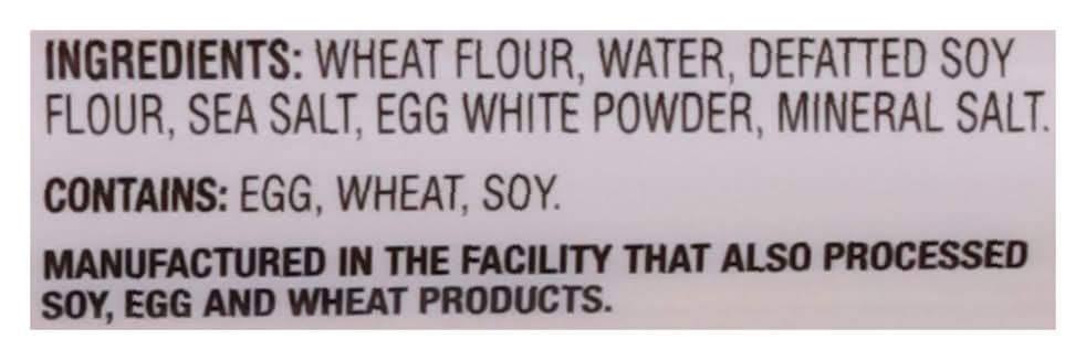 Ingredients: Wheat Flour, Water, Defatted Soy Flour, Sea Salt, Egg White Powder, Mineral Salt Contains: Eggs, Wheat, Soybeans, Soybeans, Eggs, Wheat