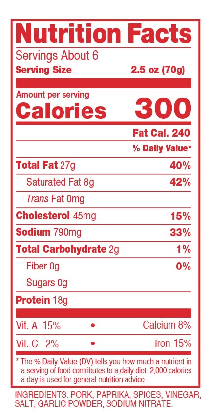 Ingredients: Pork, Paprika, Spices, Vinegar, Salt, Garlic Powder, Sodium Nitrite