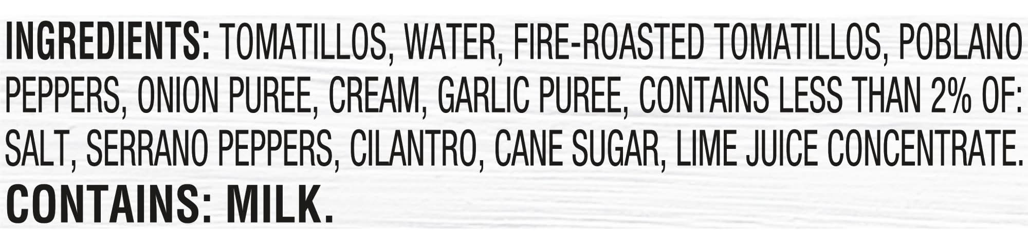 Ingredients: Fire-Roasted Tomatillos, Filtered Water, Fire-Roasted Poblano Peppers, Roasted Onions, Organic Cream, Cilantro, Roasted Garlic, Contains less than 2% of: Salt, Fire-Roasted Serrano Peppers, Cane Sugar, Lime Juice Concentrate. CONTAINS: MILK. Contains: Milk