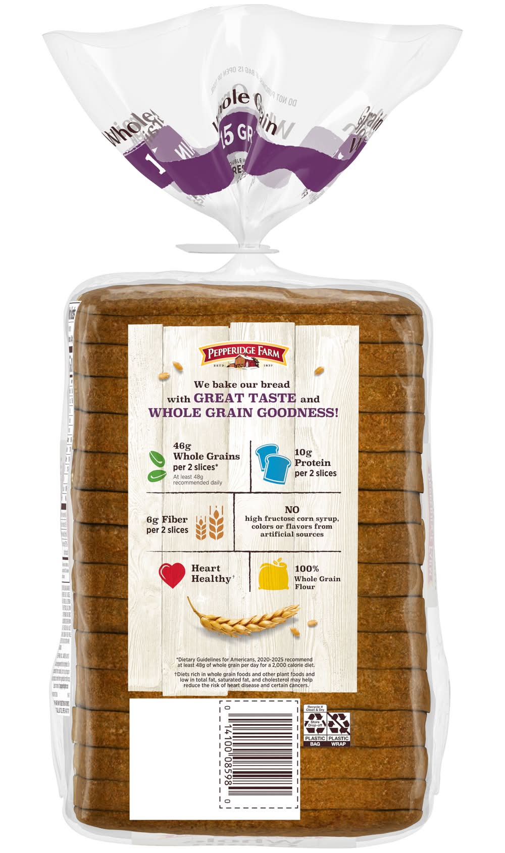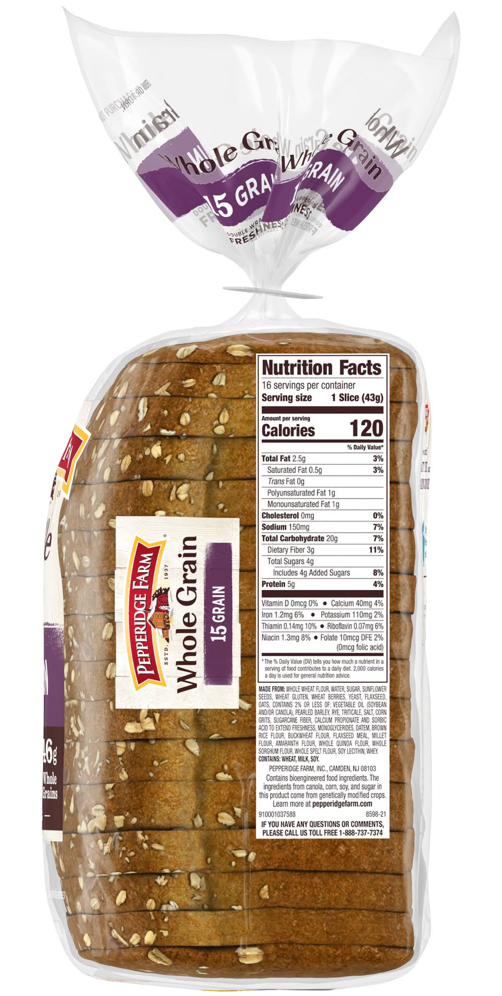 Help maintain a healthy lifestyle, deliciously, with Pepperidge Farm Whole Grain 15 Grain Bread. Two slices deliver 10 grams of protein, 6 grams of fiber, and 46 grams of whole grains. Pepperidge Farm 15 Grain bread has the perfect touch of sweetness and a satisfying blend of grains. Enjoy this multigrain bread with sandwiches or toast up a slice for breakfast! • Pepperidge Farm Inc, Norwalk, CT, 06856 • Packaging: Reusable