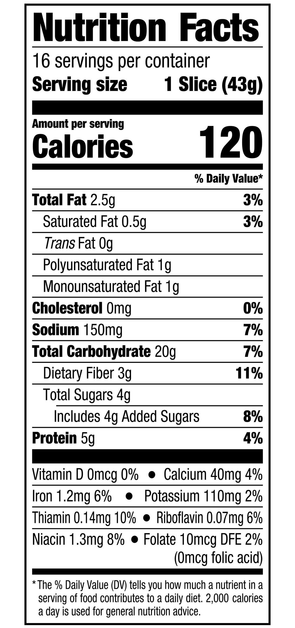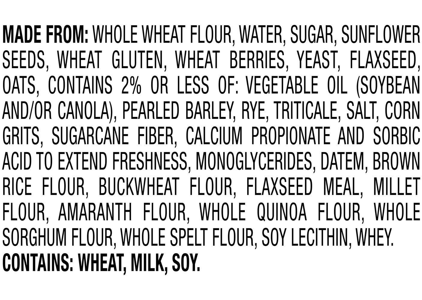 Ingredients: MADE FROM: WHOLE WHEAT FLOUR, WATER, SUGAR, SUNFLOWER SEEDS, WHEAT GLUTEN, WHEAT BERRIES, YEAST, FLAXSEED, OATS, CONTAINS 2% OR LESS OF: VEGETABLE OIL (SOYBEAN AND/OR CANOLA), PEARLED BARLEY, RYE, TRITICALE, SALT, CORN GRITS, SUGARCANE FIBER, CALCIUM PROPIONATE AND SORBIC ACID TO EXTEND FRESHNESS, MONOGLYCERIDES, DATEM, BROWN RICE FLOUR, BUCKWHEAT FLOUR, FLAXSEED MEAL, MILLET FLOUR, AMARANTH FLOUR, WHOLE QUINOA FLOUR, WHOLE SORGHUM FLOUR, WHOLE SPELT FLOUR, SOY LECITHIN, WHEY. CONTAINS: WHEAT, MILK, SOY. Contains: Milk/Dairy, Soybean, Wheat, Gluten