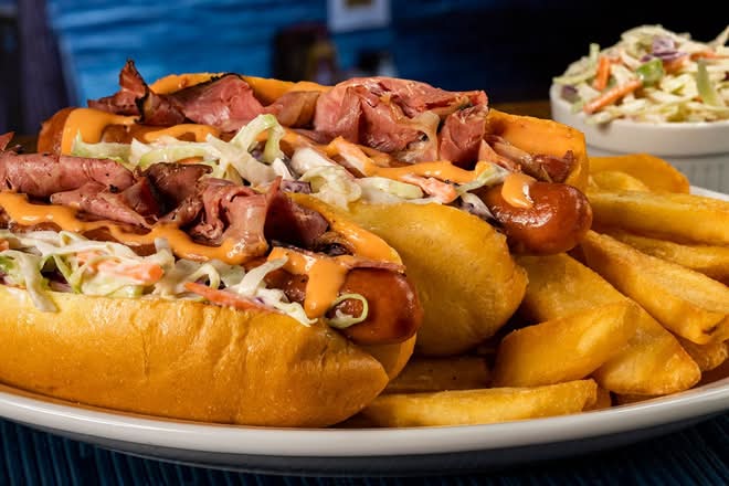 Two all-beef franks grilled to perfection, with your choice of toppings. Served with French fries and a dill pickle.