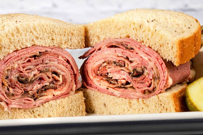 Corned beef and pastrami. A bit of heaven. Served with cole slaw and a dill pickle.
